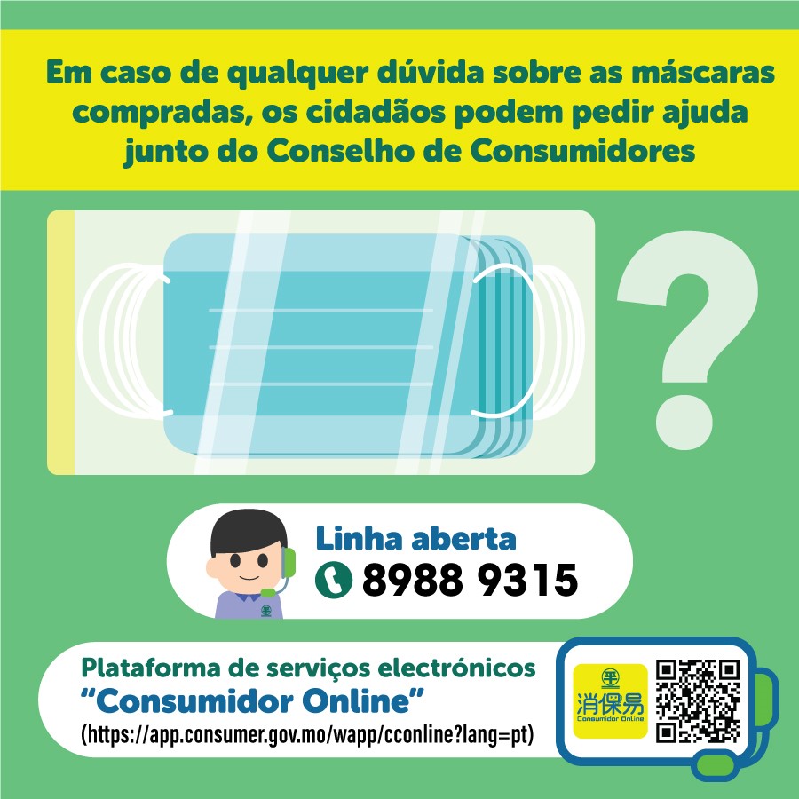 Os residentes que compraram máscaras dos lotes acima referidos, caso tenham dúvidas, podem pedir ajuda junto do CC através da linha directa n.º 89889315 ou da plataforma de serviços electrónicos “Consumidor Online” (https://app.consumer.gov.mo/wapp/cconline?lang=pt).