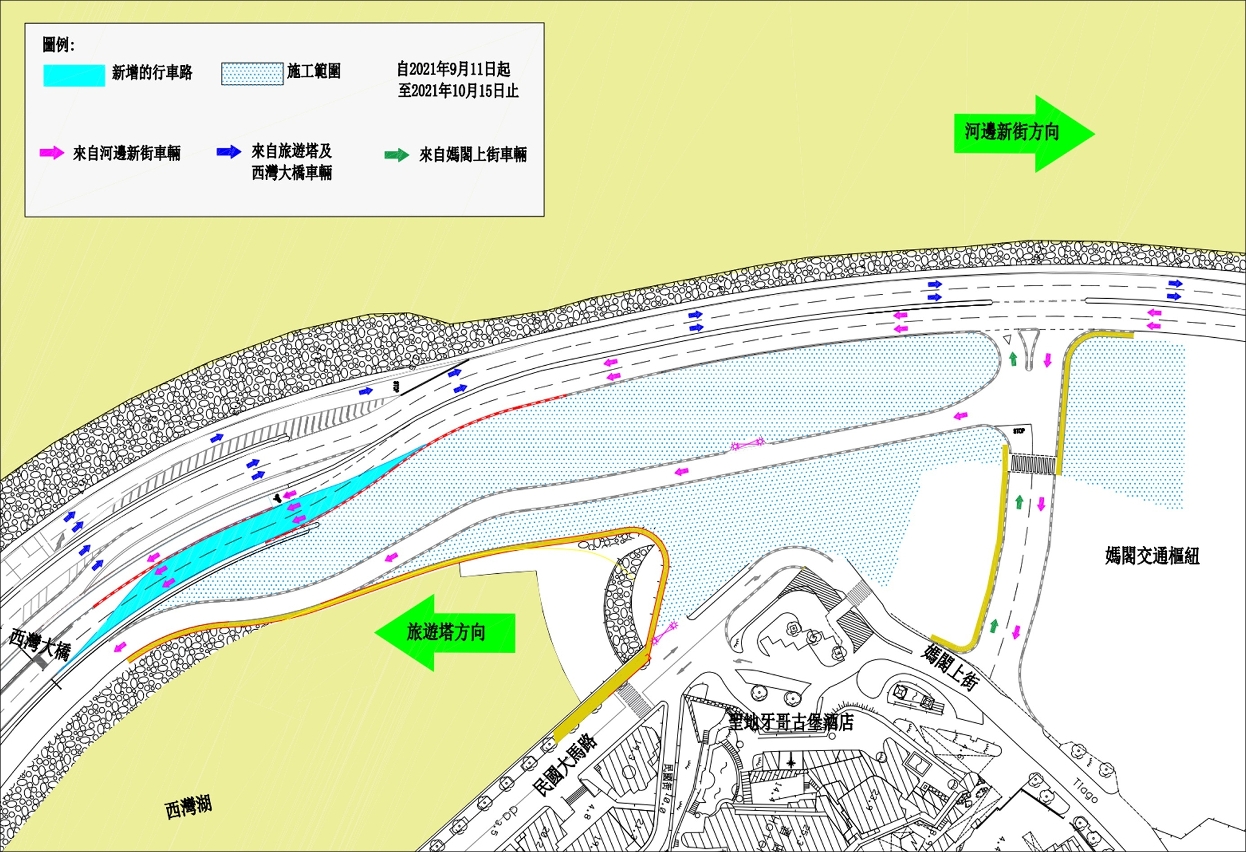 - 16 de Outubro até 23 de Novembro: Será cancelado um troço da faixa de rodagem provisória em direcção à Torre de Macau e os veículos terão de circular a linha sul da actual Avenida Panorâmica do Lago Sai Van em direcção à Torre de Macau (vide figura 3);