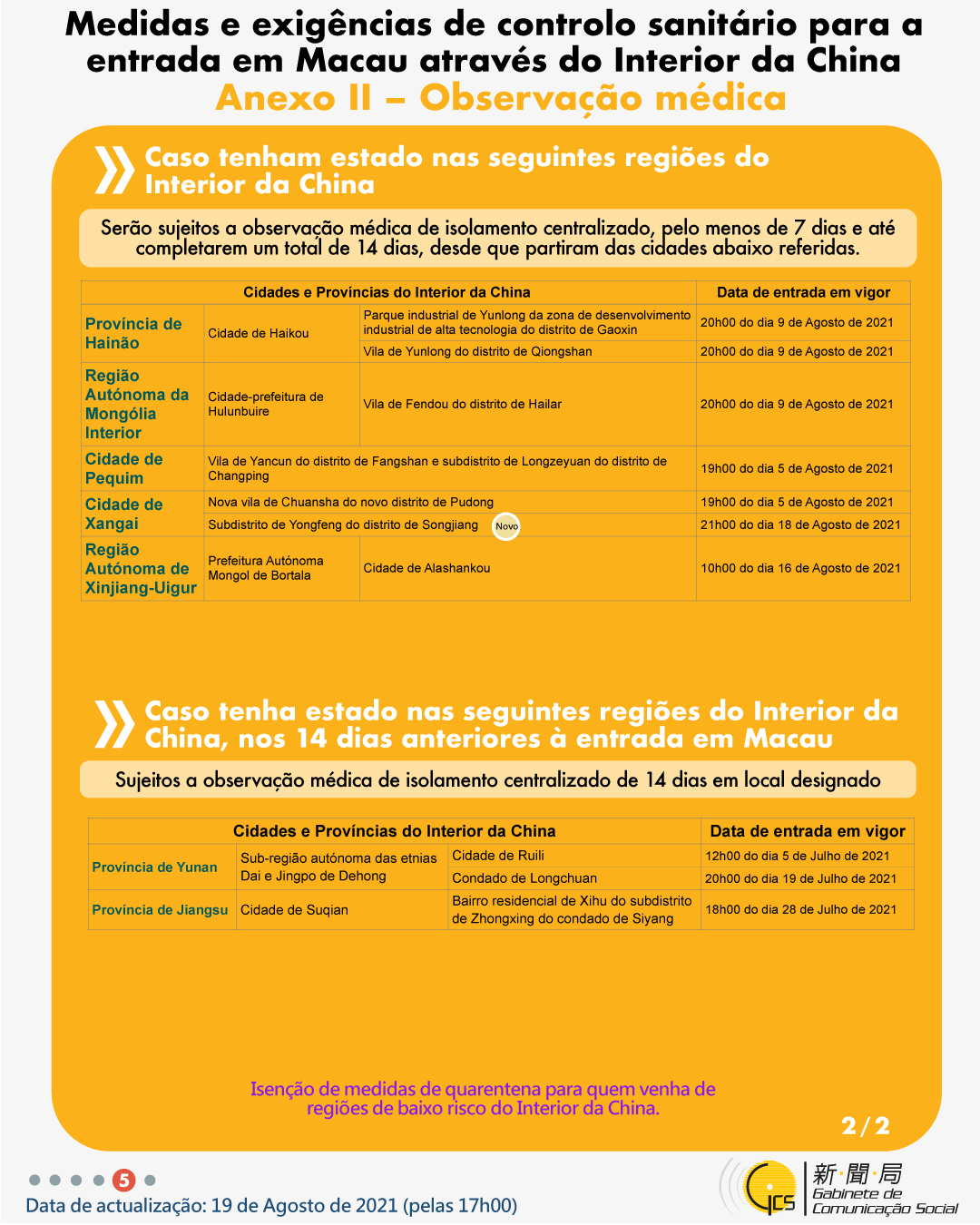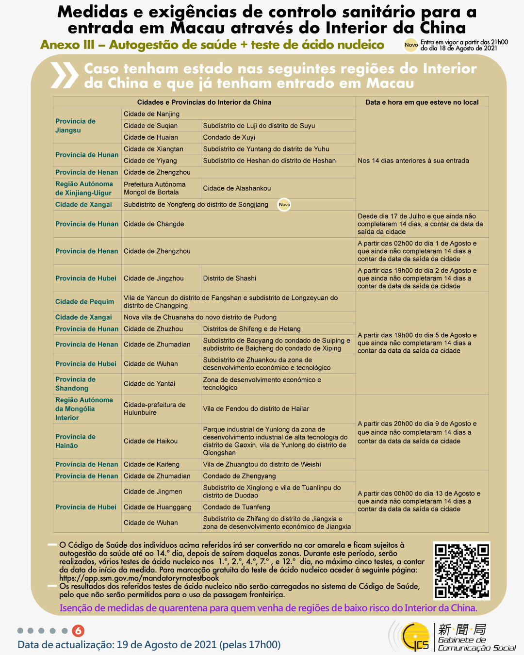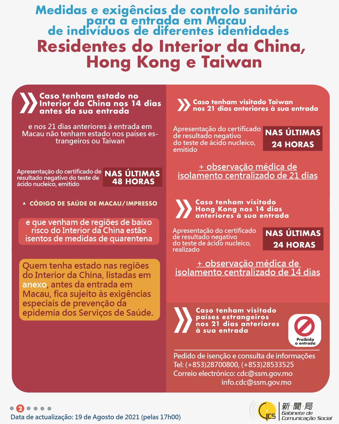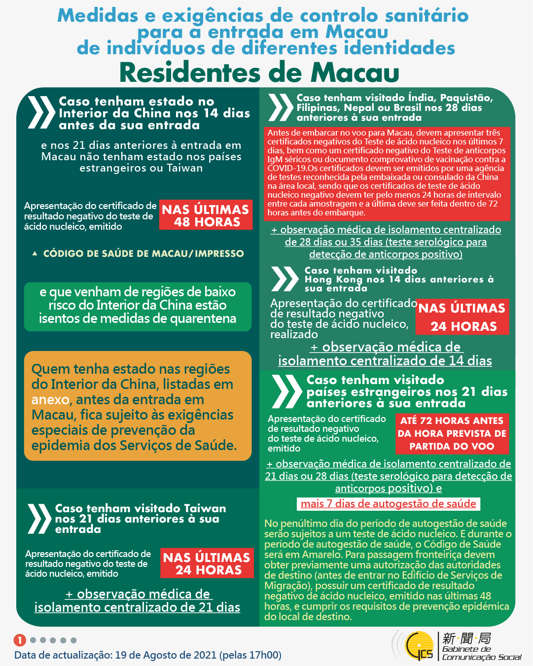 (Infografia)Medidas e exigências de controlo sanitário para a entrada em Macau de indivíduos de diferentes identidades, actualizadas no dia 19 de Agosto de 2021