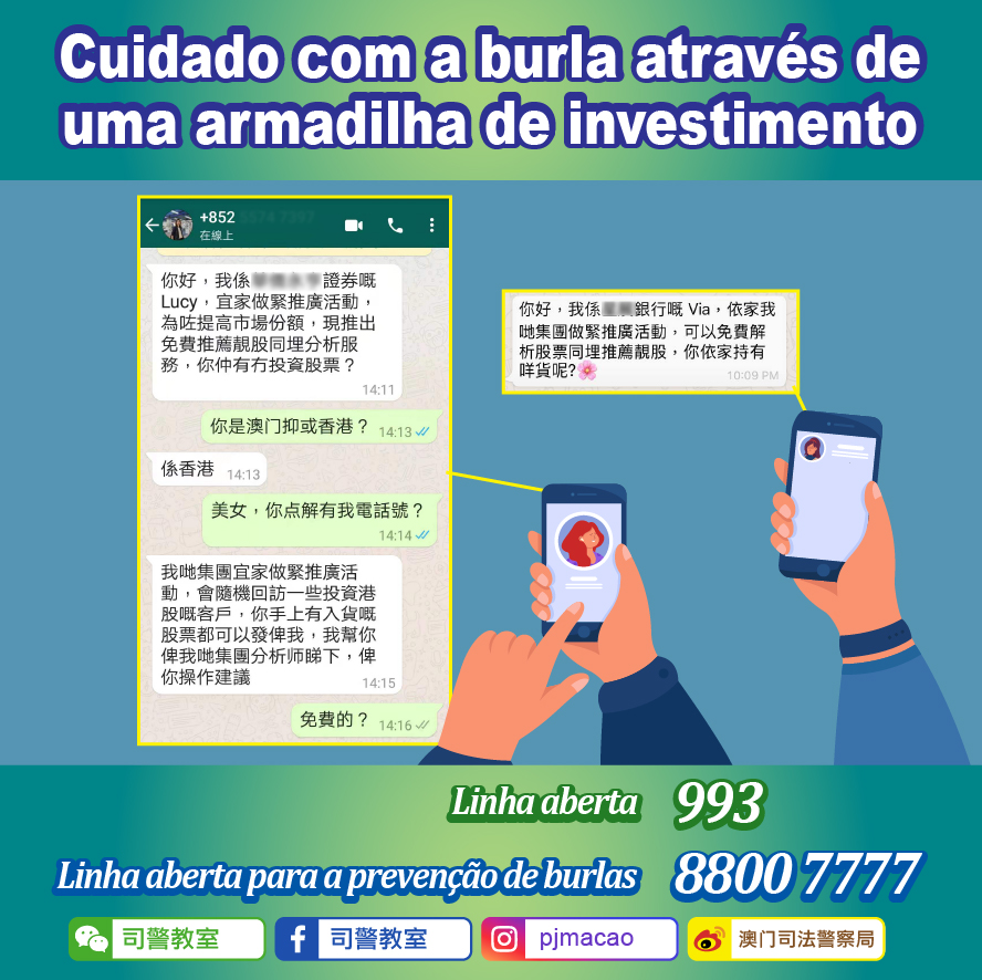 Recentemente, através da linha aberta para a prevenção de burlas, vários cidadãos informaram a PJ que tinham recebido mensagens de um indivíduo desconhecido que alegava ser funcionário de um serviço de financiamento de acções de uma empresa e que o seu grupo estava a fazer promoção, selecionando, de forma aleatória, clientes para investirem em acções de Hong Kong . Esse indivíduo disse também faziam recomendações de acções potenciais aos clientes dando-lhes, gratuitamente, o serviço de análise sobre o investimento de acções. Contudo, os cidadãos têm prestado atenção às recentes informações divulgadas pela polícia sobre a prevenção de burlas, nomeadamente de armadilha de investimento e bloquearam imediatamente a conta desconhecida e, de seguida, reportaram os tais casos à polícia.