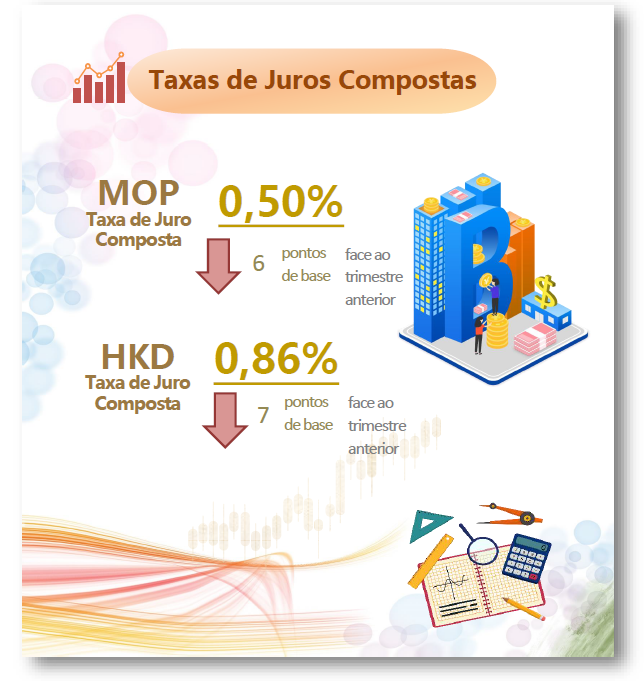 No final de Junho 2021, as taxas de juro compostas da Pataca e do Dólar de Hong Kong, registadas no final de Março 2021 descreram de 0,56% e 0,93%, para 0,50% e 0,86%, respectivamente. As correspondentes descidas cifraram-se em 6 pontos de base e 7 pontos de base, reflectindo uma queda geral do custo do capital para os bancos de Macau, no segundo trimestre de 2021.