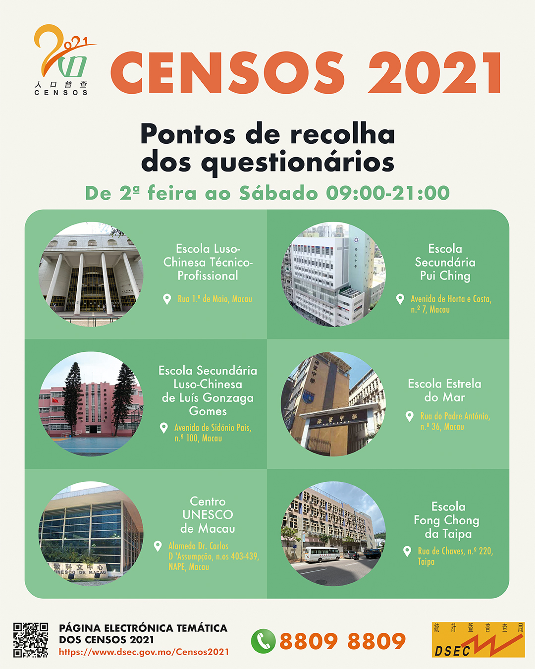 A DSEC agradece o apoio e colaboração prestados pelos cidadãos e apela aos agregados familiares que ainda não tenham completado o preenchimento do questionário para fornecerem as informações, através da internet, ou por via telefónica, ou preenchendo o questionário em suporte de papel, ou marcando a entrevista com o agente de censos, até ao próximo sábado (dia 28). Para mais pormenores sobre os Censos, queira aceder à página electrónica temática dos Censos 2021: https://www.dsec.gov.mo/Censos2021