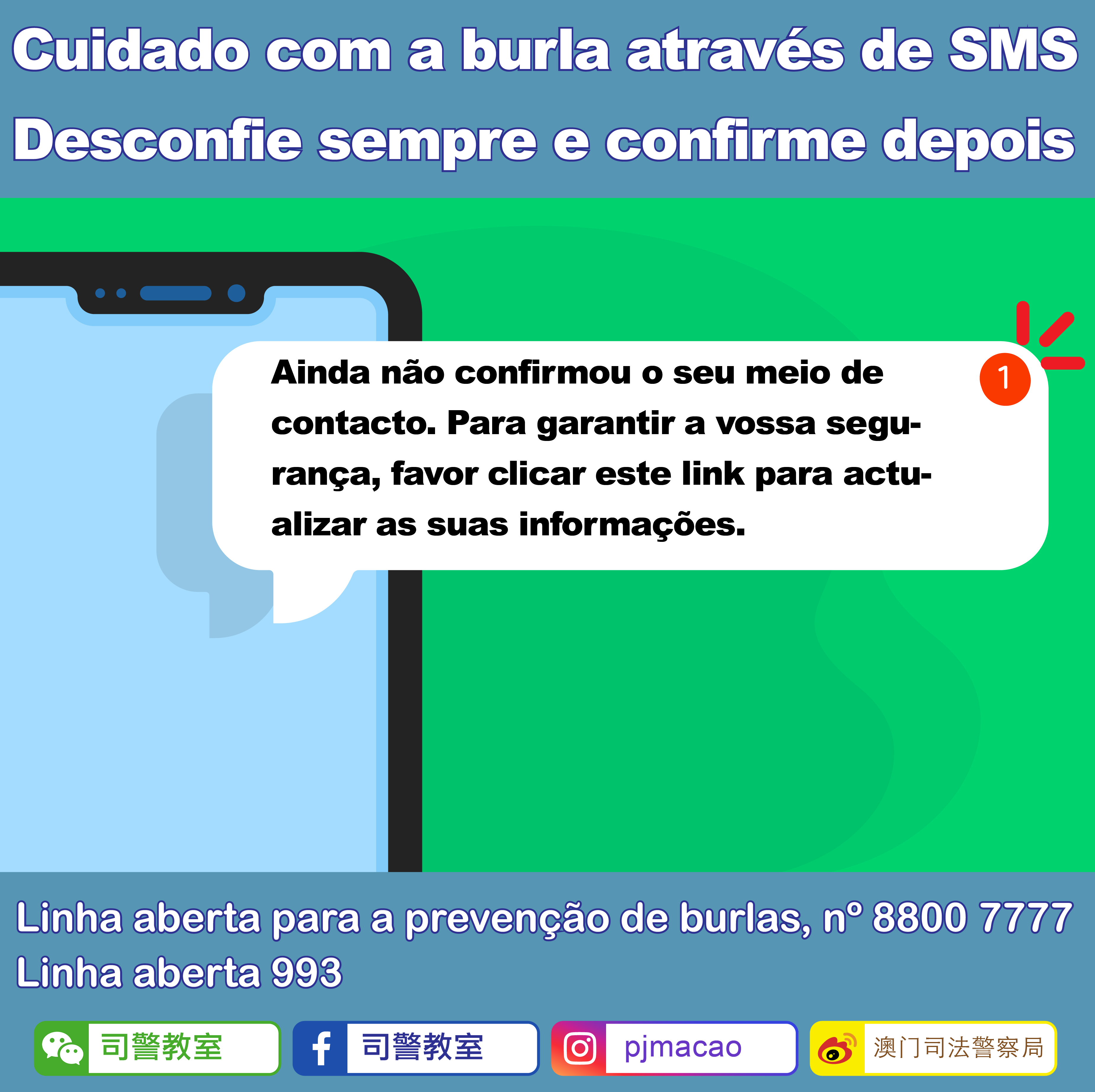 Recentemente, um cidadão denunciou à PJ ter recebido um SMS emitido por um banco, dizendo que o receptor ainda não tinha confirmado o meio de contacto pelo que, para garantir a segurança, devia clicar o link indicado no mesmo SMS para actualizar as suas informações. O cidadão, contudo, desconfiou que conteúdo do mesmo SMS fosse uma burla, tendo feito a confirmação no dia seguinte com o tal banco. Este banco confirmou que nunca tinha mandado o referido SMS, pelo que o cidadão reportou imediatamente o caso à polícia.