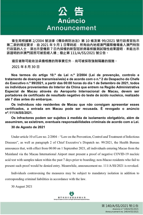 O Centro de Coordenação de Contingência do Novo Tipo de Coronavírus anuncia que a partir das 00H00 horas do dia 1 de Setembro de 2021 passa a ser exigido a amostragem do certificado negativo do teste de ácido nucleico realizado nos 7 dias anteriores ao embarque aos indivíduos que sejam provenientes do Interior da China e entrem ou saiam de Macau através de Aeroporto Internacional de Macau.