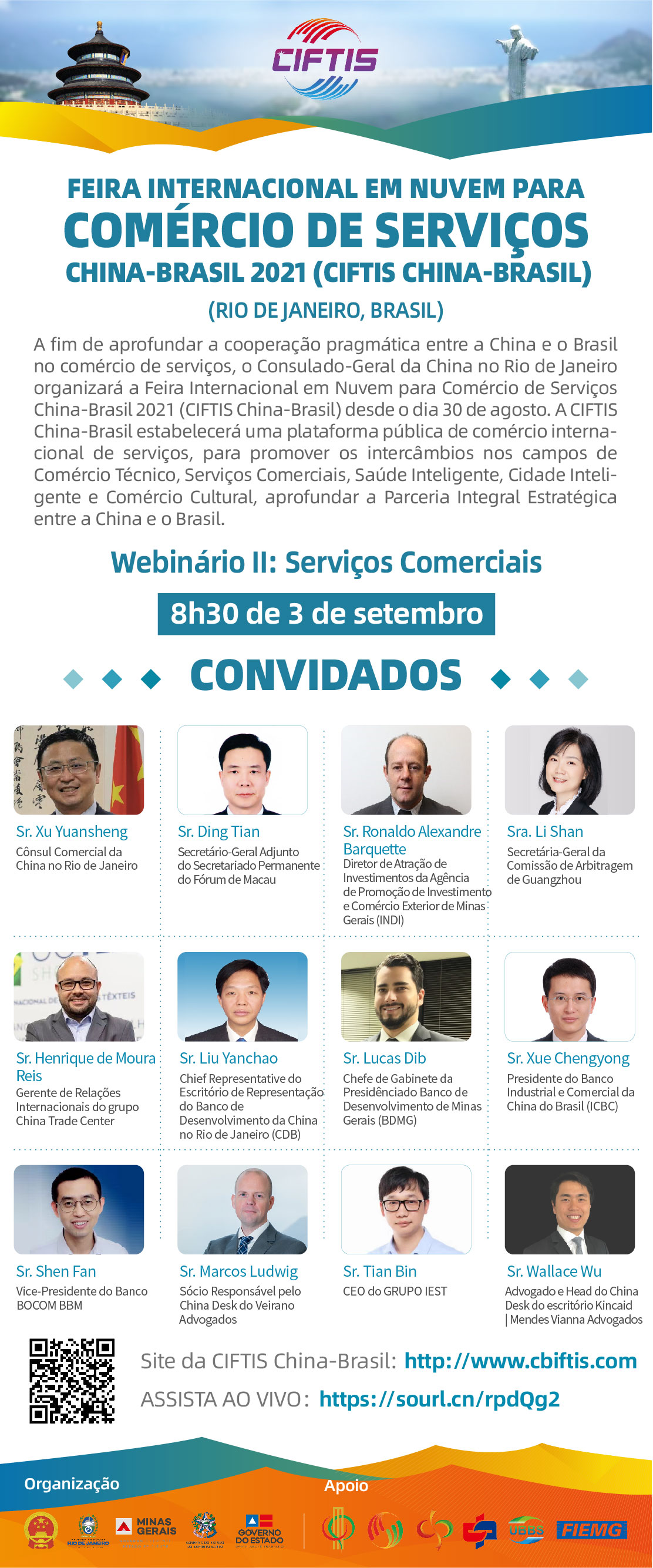 A Feira Internacional para Comércio de Serviços China-Brasil de 2021 é organizada pelo Consulado Geral da República Popular da China no Rio de Janeiro, Governo Municipal de Pequim, Governo Provincial de Jiangsu, Governo do Estado do Rio de Janeiro, Governo do Estado de Minas Gerais, Governo do Estado do Espírito Santo, Governo do Estado da Bahia, etc., com a coorganização do Secretariado Permanente do Fórum de Macau, do Conselho para Promoção de Investimento Internacional da China e da União para Serviços Empresariais de Pequim, sendo transmitida online através das plataformas nas redes sociais como Weibo, Kwai, etc.