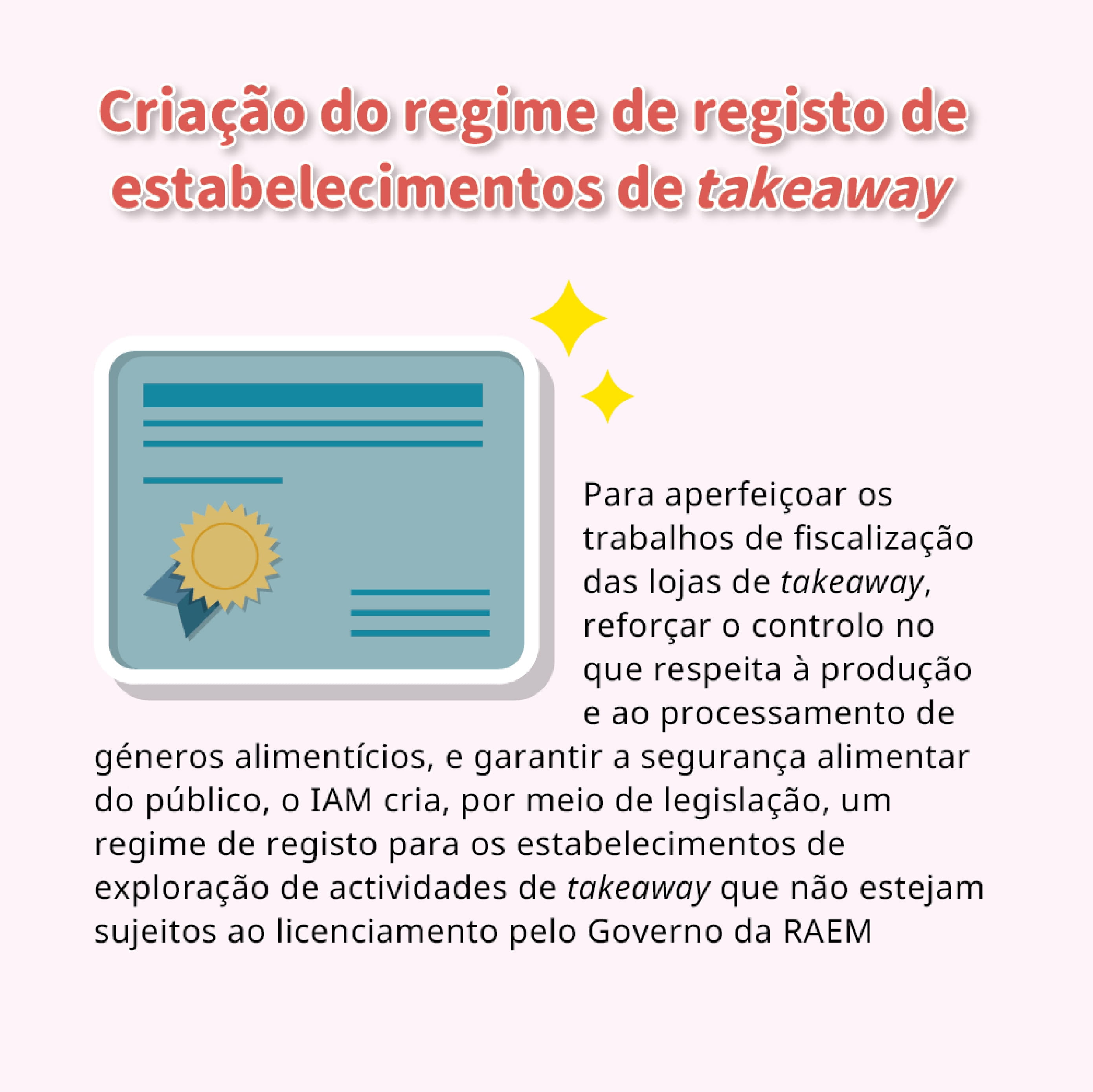 O Instituto para os Assuntos Municipais, através da forma de legislação, cria o regime de registo dos estabelecimentos que exploram actividades de takeaway ainda não abrangidos pelas normas de licenciamento do Governo da RAEM, com vista a melhorar a supervisão sobre os estabelecimentos de takeaway, intensificando o controlo da produção e processamento de géneros alimentícios, para salvaguardar a segurança alimentar do público.