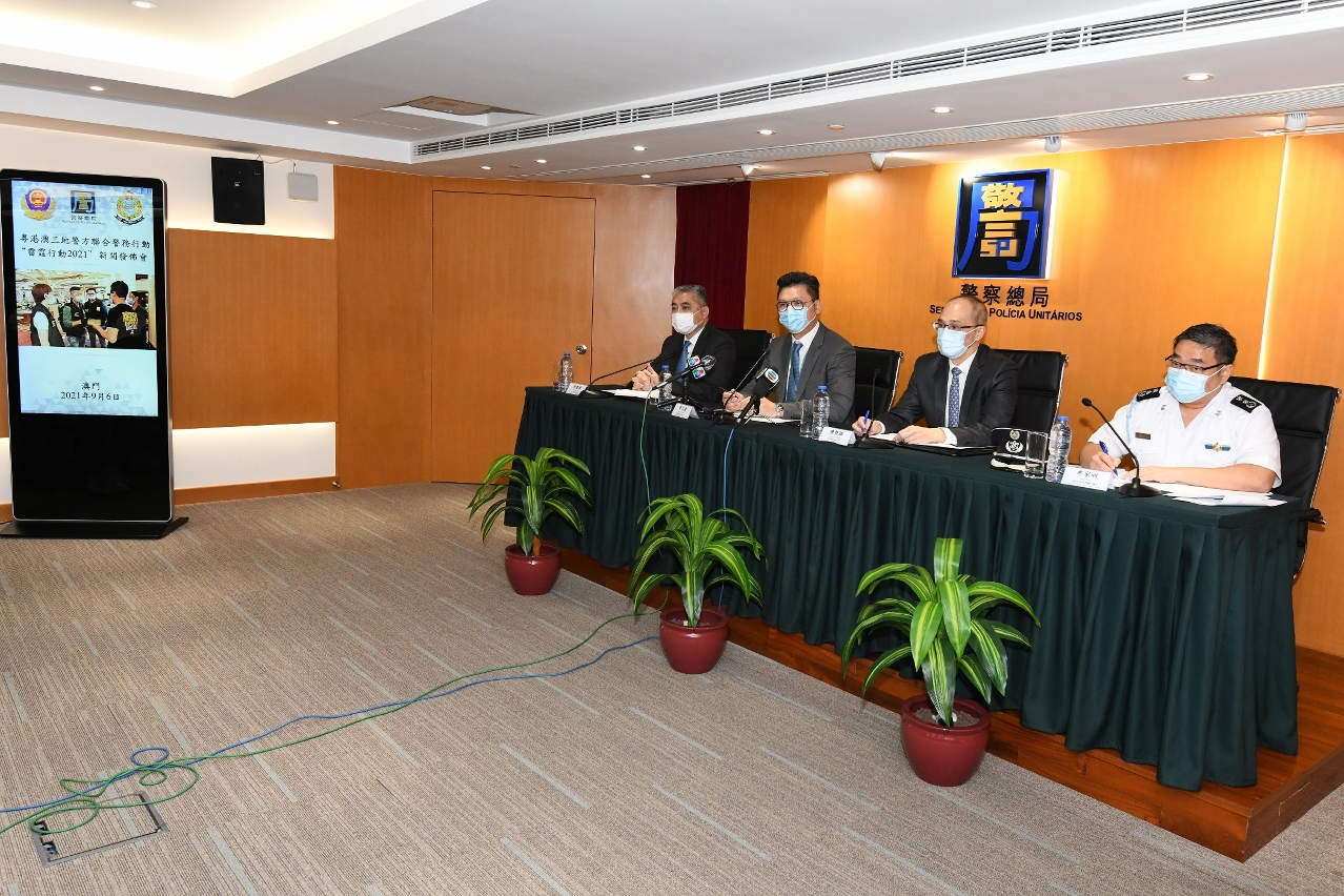 Realizou-se, hoje (dia 6 de Setembro), pelas 10h00, em simultâneo com as autoridades policiais de Guangdong, Hong Kong e Macau, a conferência de imprensa sobre o balanço da “Operação Trovoada 2021”. A conferência em Macau teve lugar nos Serviços de Polícia Unitários (SPU) e foi presidida pelo Adjunto do Comandante-geral dos SPU, Vong Chi Hong, com a presença do Subdirector da Polícia Judiciária (PJ), Chan Kin Hong, Segundo-comandante do Corpo de Polícia de Segurança Pública (CPSP), Leong Heng Hong e o Chefe de Departamento, substituto, dos Serviços de Alfândega (SA), José Pou.