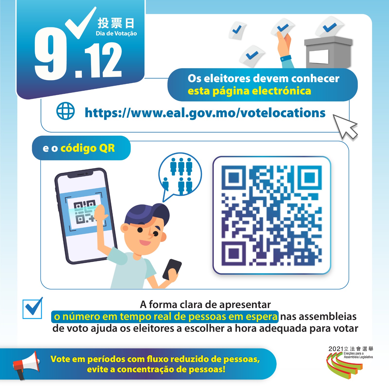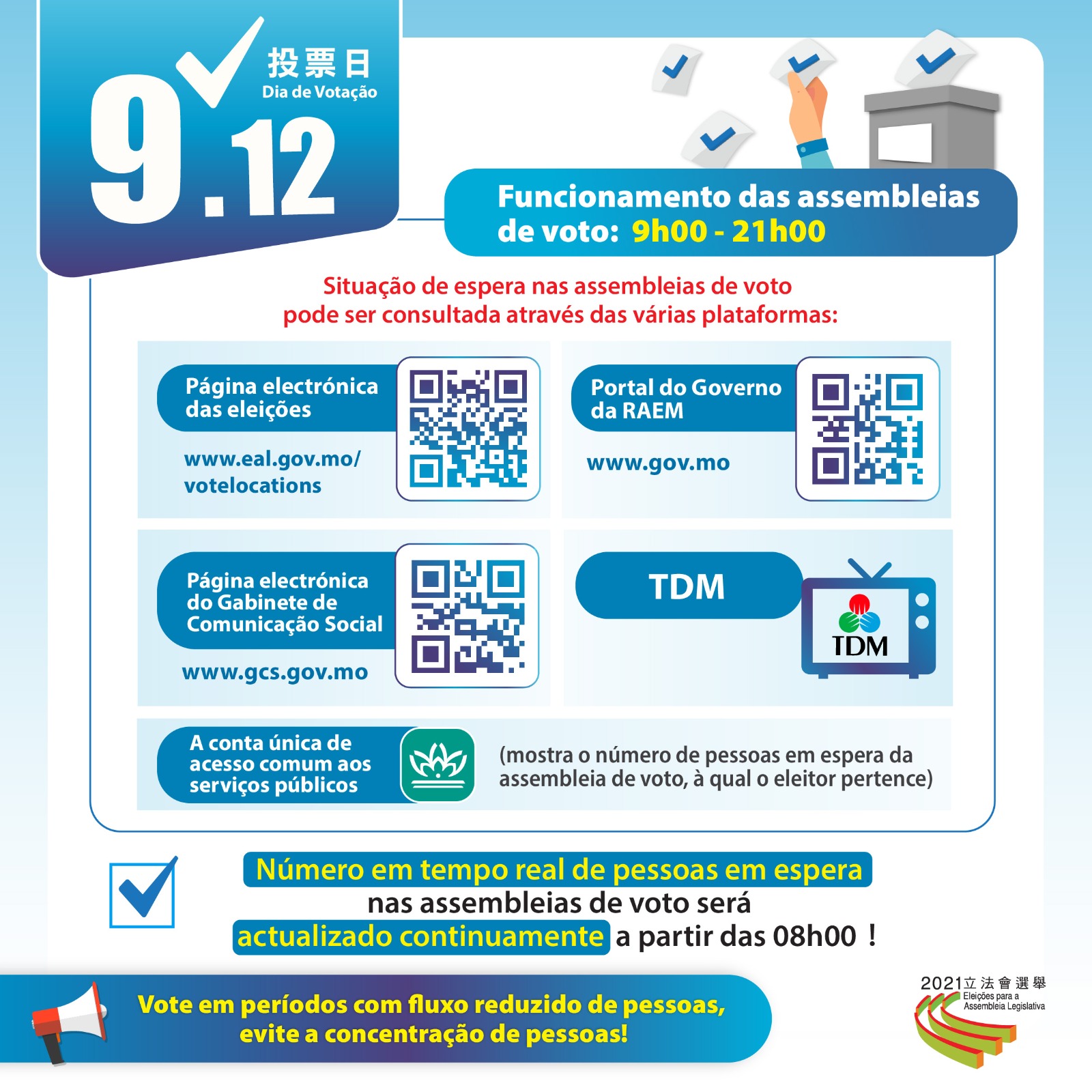 A partir das 08h00 do dia das eleições (12 de Setembro), os eleitores podem consultar a “Situação de espera das assembleias de voto” na página electrónica das Eleições para a Assembleia Legislativa. O número de pessoas em espera em tempo real de cada assembleia de voto será actualizado constantemente na respectiva tabela.