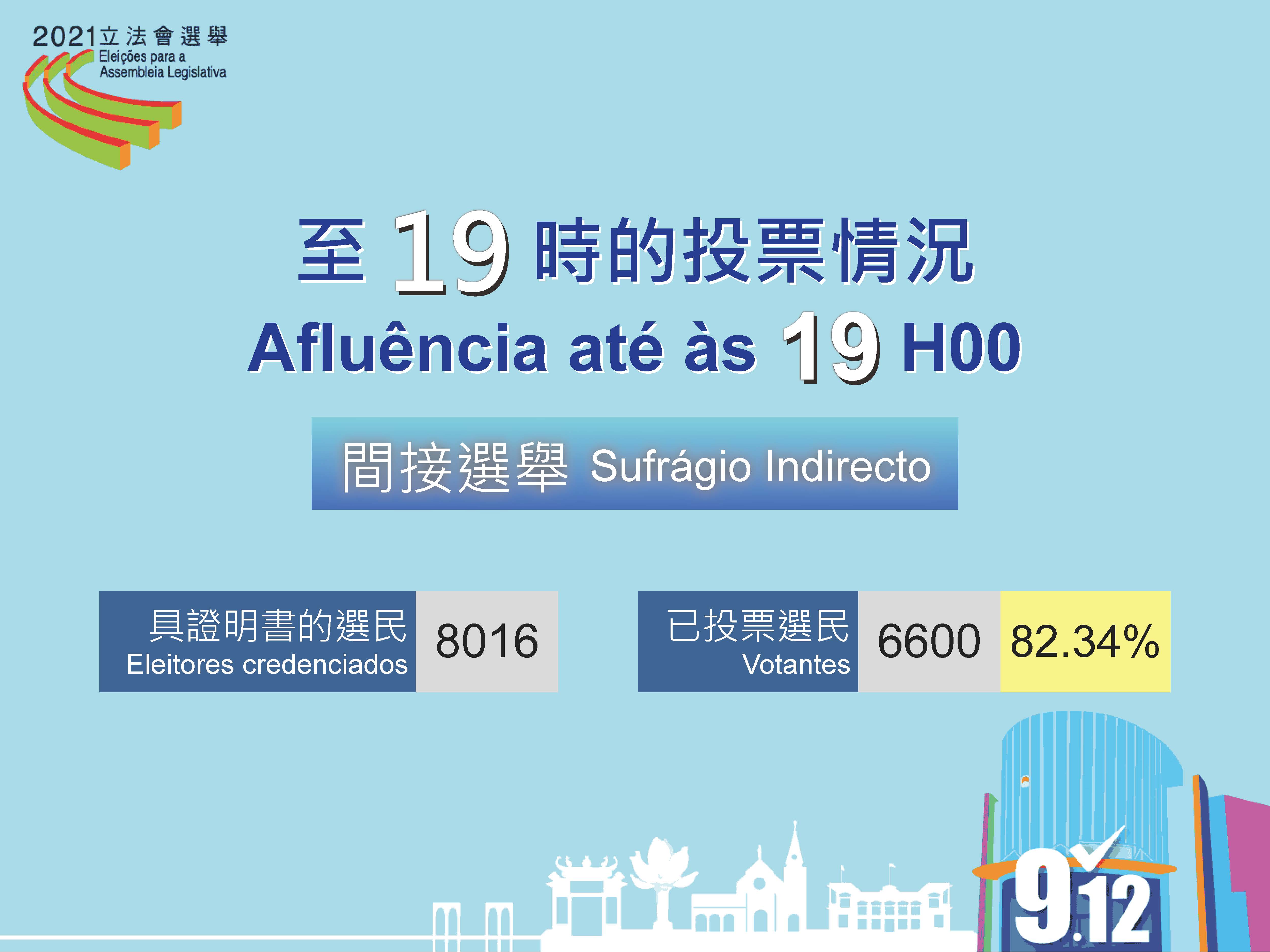 Até às 19h00, desde abertura das assembleias de voto, a taxa de afluência às urnas do sufrágio directo foi de 37,88 por cento, num total de 122 692 pessoas, que votaram nas Eleições da Assembleia Legislativa, 12 de Setembro. No sufrágio indirecto votaram 6 600 pessoas, representando uma taxa de afluência de 82,34 por cento.