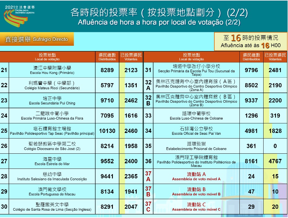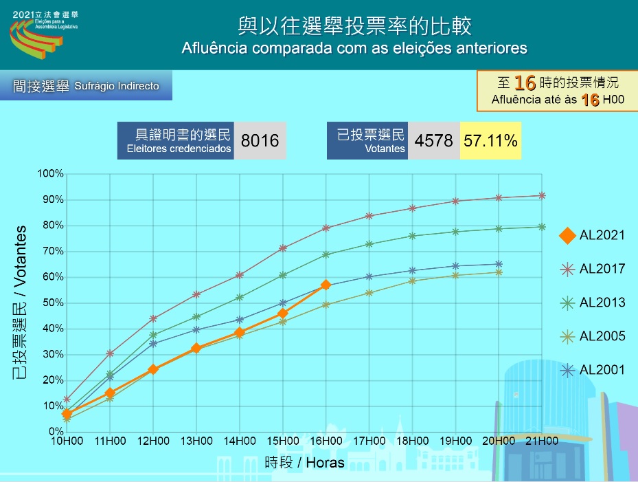 Nas primeiras sete horas desde abertura das assembleia de voto das Eleições da Assembleia Legislativa, dia 12 Setembro, até às 16 h00, votaram no sufrágio directo 88 520 pessoas, sendo a taxa de afluência 27,33 por cento. No sufrágio indirecto votaram 4 578 pessoas, representando uma taxa de afluência  de 57,11 por cento.