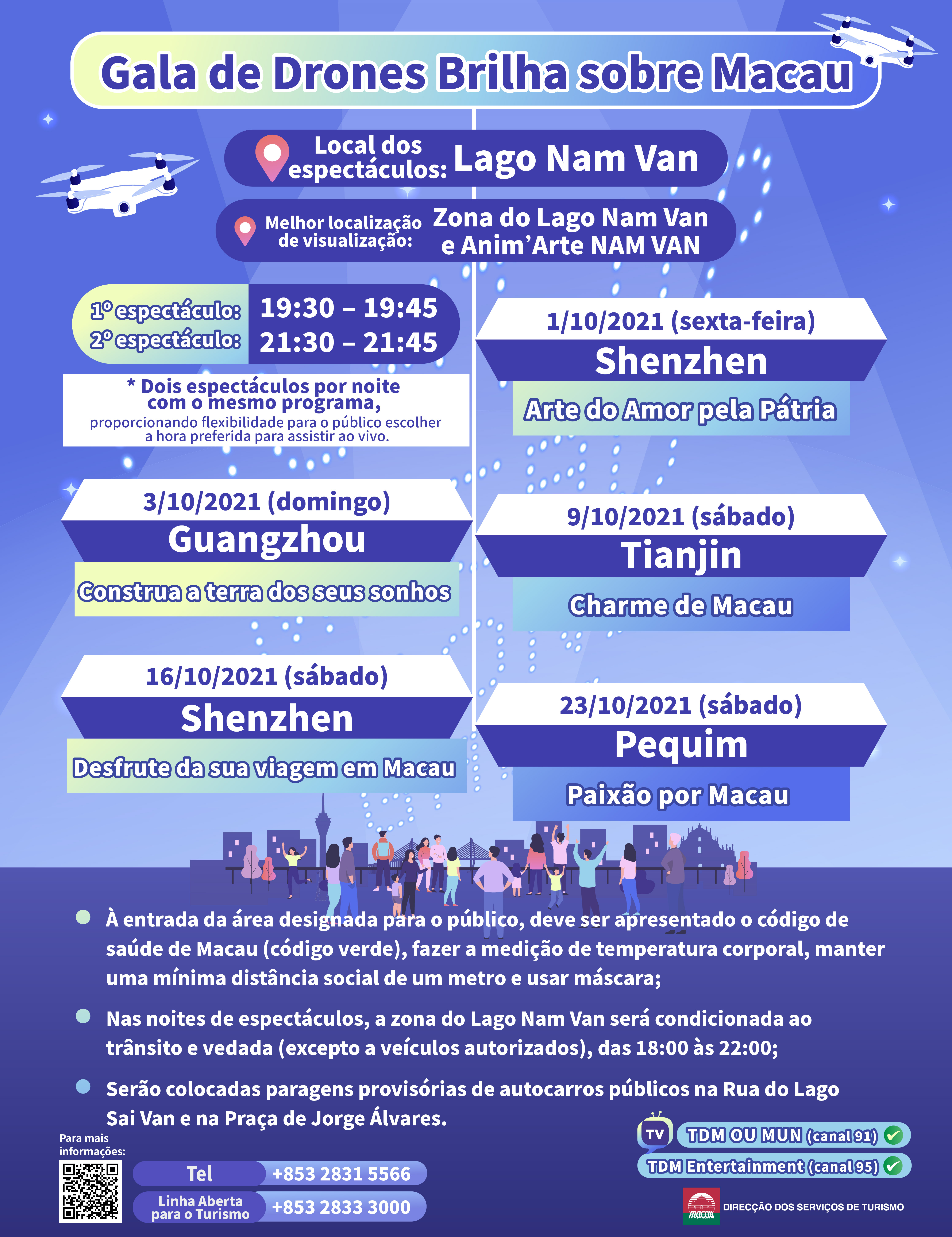 A Direcção dos Serviços de Turismo (DST) organiza pela primeira vez o evento “Gala de Drones Brilha sobre Macau”, que terá lugar entre 1 e 23 de Outubro, no Lago Nam Van. Dez espectáculos de drones realizar-se-ão nos dias 1, 3, 9, 16 e 23 de Outubro às 19h30 e às 21h30, apresentando duas exibições por noite com o mesmo programa. Os residentes e visitantes podem escolher a sessão no horário mais conveniente para assistir aos espectáculos na zona do Lago Nam Van e Anim'Arte NAM VAN. Cada espectáculo usará mais de 300 drones, e terá uma duração de 10 a 15 minutos.