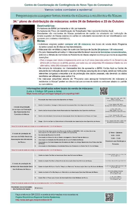 O Centro de Coordenação de Coordenação de Contingência do Novo Tipo de Coronavírus informa que no próximo dia 24 de Setembro, Sexta-feira, terá inicio o 34.º Plano de fornecimento de máscaras destinado aos residentes de Macau. O período de venda irá decorrer durante 30 dias, entre 24 de Setembro e 23 de Outubro de 2021.