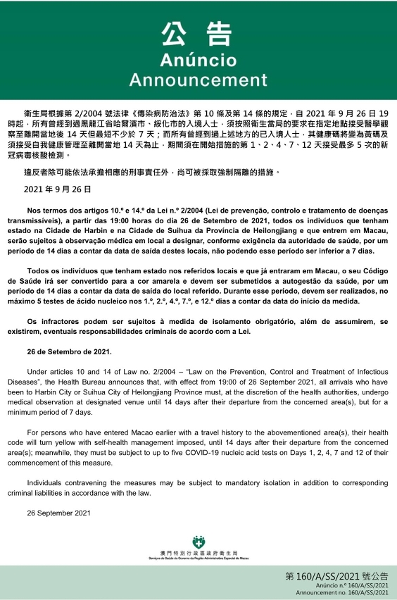 O Centro de Coordenação de Contingência do Novo Tipo de Coronavírus informa que tendo em consideração a evolução epidemiológica mais actualizada na Província de Heilongjiang, nos termos dos artigos 10.º e 14.º da Lei n.º 2/2004 (Lei de prevenção, controlo e tratamento de doenças transmissíveis), a partir das 19:00 horas do dia 26 de Setembro de 2021, todos os indivíduos que tenham estado na Cidade de Harbin e na Cidade de Suihua da Província de Heilongjiang e que entrem em Macau, serão sujeitos à observação médica em local a designar, conforme exigência da autoridade de saúde, por um período de 14 dias a contar da data de saída destes locais, não podendo esse período ser inferior a 7 dias.