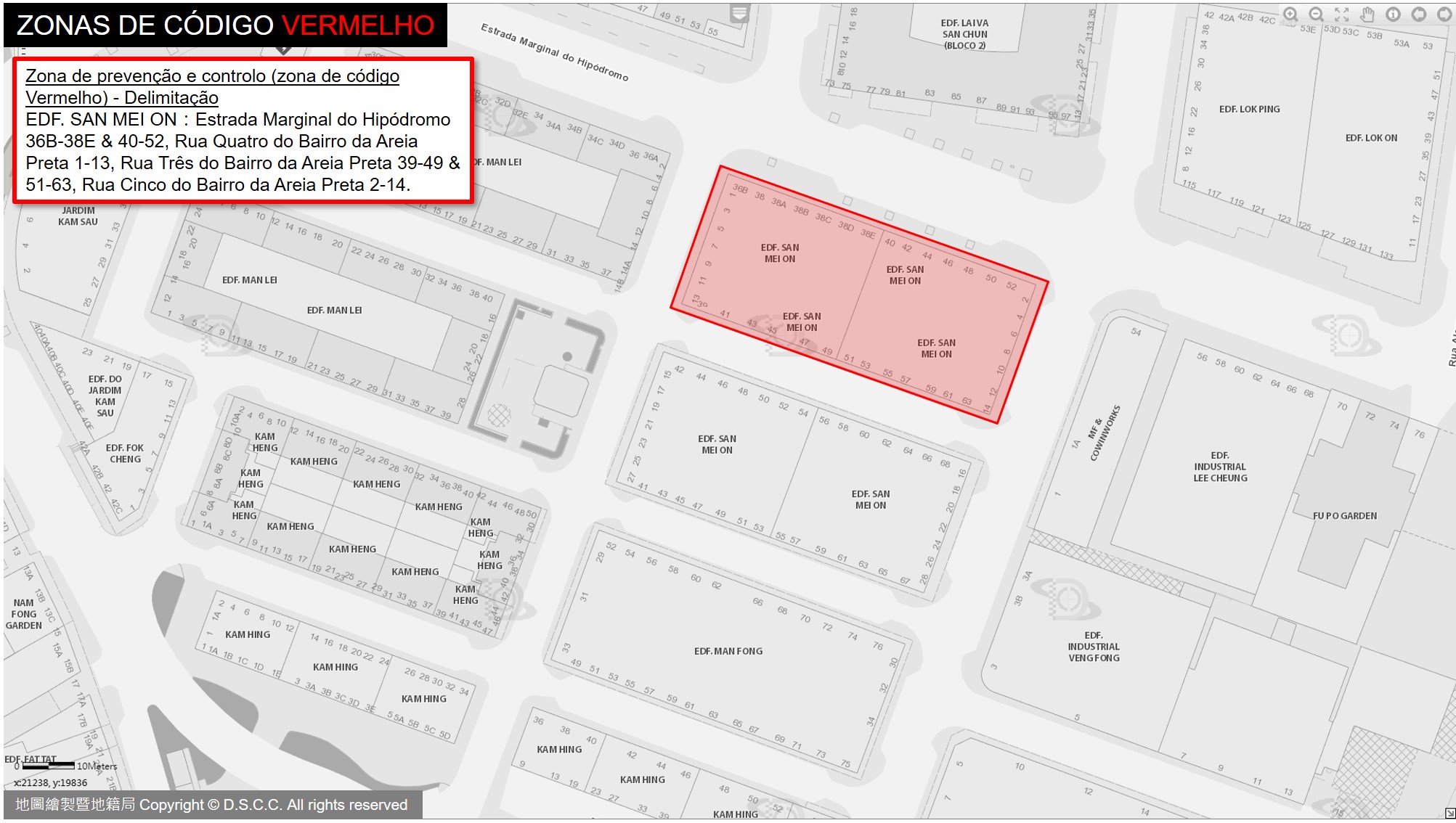 Zonas de código vermelho: Edf. San Mei On (Estrada Marginal do Hipódromo 36B-38E e 40-52, Rua Quatro do Bairro da Areia Preta 1-13, Rua Três do Bairro da Areia Preta 39-49 e 51-63, Rua Cinco do Bairro da Areia Preta 2-14