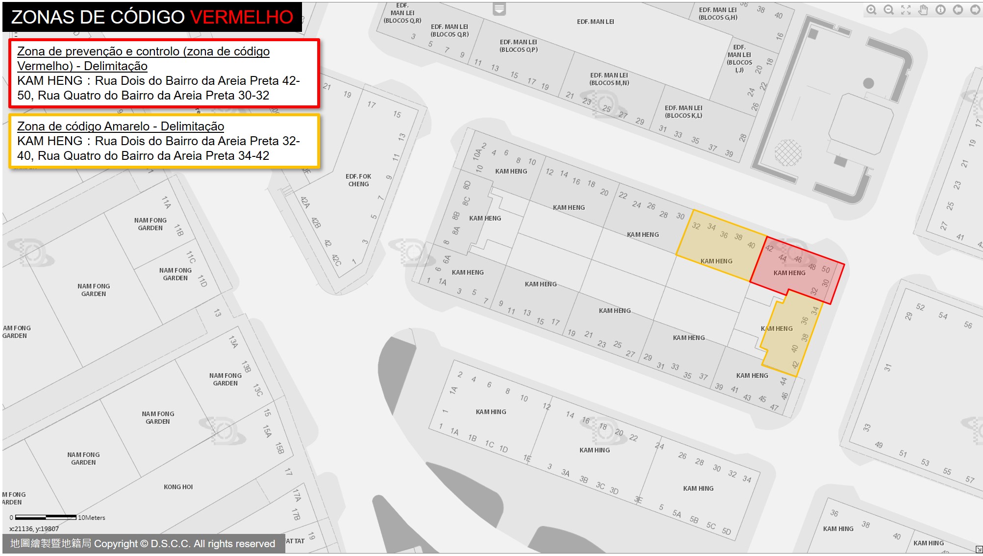 Zonas de código amarelo: Edf. Kam Heng, Rua Dois do Bairro da Areia Preta 30-40, Rua Quatro do Bairro da Areia Preta 34-42.