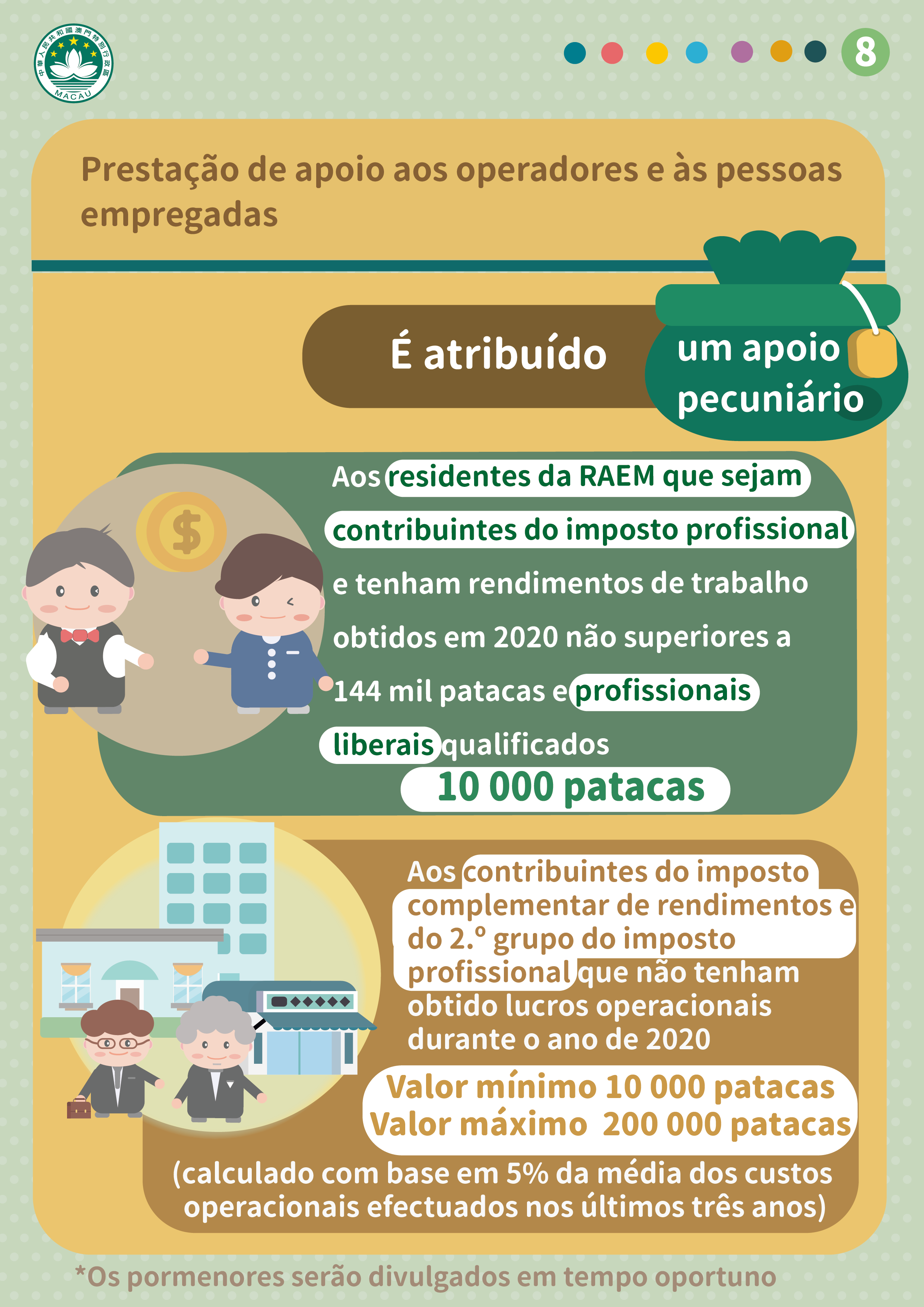 É atribuído a cada residente da RAEM que seja contribuinte do imposto profissional e tenha rendimentos de trabalho obtidos durante o ano de 2020 não superiores a 144 mil patacas, bem como a cada profissional liberal que reúna os requisitos definidos, um apoio pecuniário no valor de 10 mil patacas.