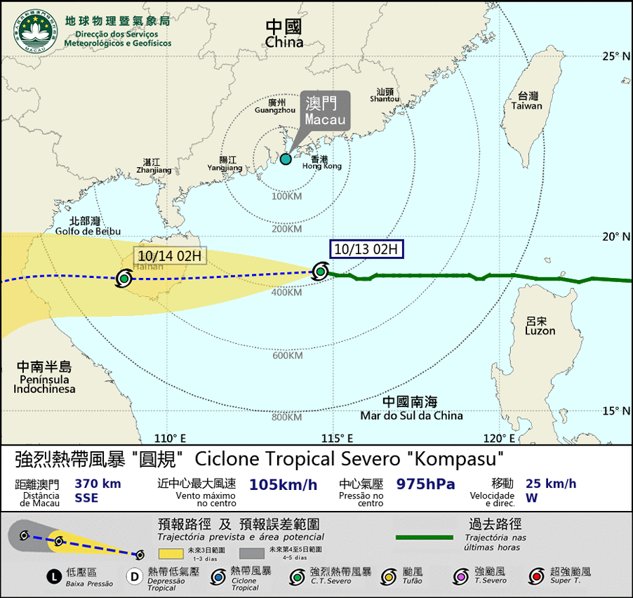 O “Kompasu” está a atravessar a parte setentrional do Mar do Sul da China e a aproximar-se do território progressivamente. No início da manhã, o ciclone tropical vai passar o ponto mais próximo da região, a cerca de 350 km a sul de Macau, deslocando-se, genericamente para a Ilha de Hainan. Com a aproximação do “Kompasu” a faixa da chuva relacionada está a afectar Macau. Nas próximas horas, os aguaceiros vão tornar-se mais frequentes. O vento vai intensificar-se, significativamente. O vento máximo pode atingir o nível 8 a 9 da escala “Beaufort” e a direcção será do quadrante norte alterado para leste a nordeste. Sugere-se à população que preste atenção à variação de direcção do vento.
