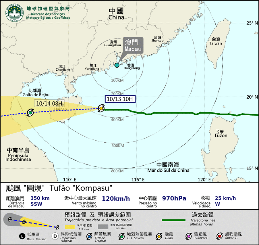 O tufão “Kompasu”atravessou a sul de Macau e continuará a deslocar-se para oeste. Entre a tarde e a noite de hoje, o sitema vai atingir na terra da Ilha de Hainan. Sob a influência da circulação assiociada, os aguaceiros vão tornar-se mais frequentes. Nas próximas horas, a direcção do vento vai mudar para o quadrante leste, e vai intensificar-se. Sugere-se à população que preste atenção à variação de direcção do vento.
