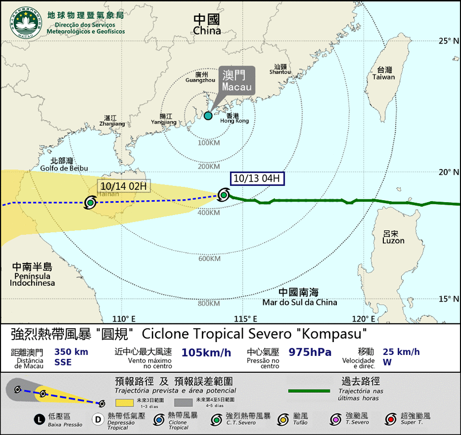 O “Kompasu” está a passar cerca de 350 quilómetros a sul de Macau. O impacto do sistema em Macau será o mais significativo nas próximas horas. Os aguaceiros vão tornar-se mais frequentes. O vento vai intensificar-se, significativamente. O vento máximo pode atingir o nível 8 a 9 da escala “Beaufort”, soprando ao nordeste, posteriormente, alterado para quadrante leste. Sugere-se à população que preste atenção à variação de direcção do vento. Espera-se que o “Kompasu” continue a mover-se para o quadrante oeste, atravessando a parte setentrional do Mar do Sul da China. Por volta da noite, o ciclone tropical vai atingir na terra de Ilha de Hainan.
