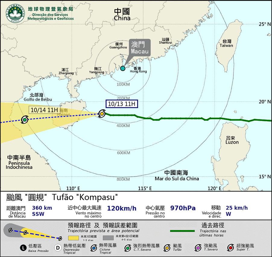 O tufão “Kompasu”está a mover-se mais para oeste. Entre a tarde e a noite, vai atingir na terra da Ilha de Hainan. O tempo na região continua a ser afectado pela circulação relacionada. Deste modo, nas próximas horas, continua a ocorrer chuva forte, com o vento forte e a sua direcção vai mudar para o quadrante leste. Sugere-se à população que preste atenção à variação de direcção do vento.