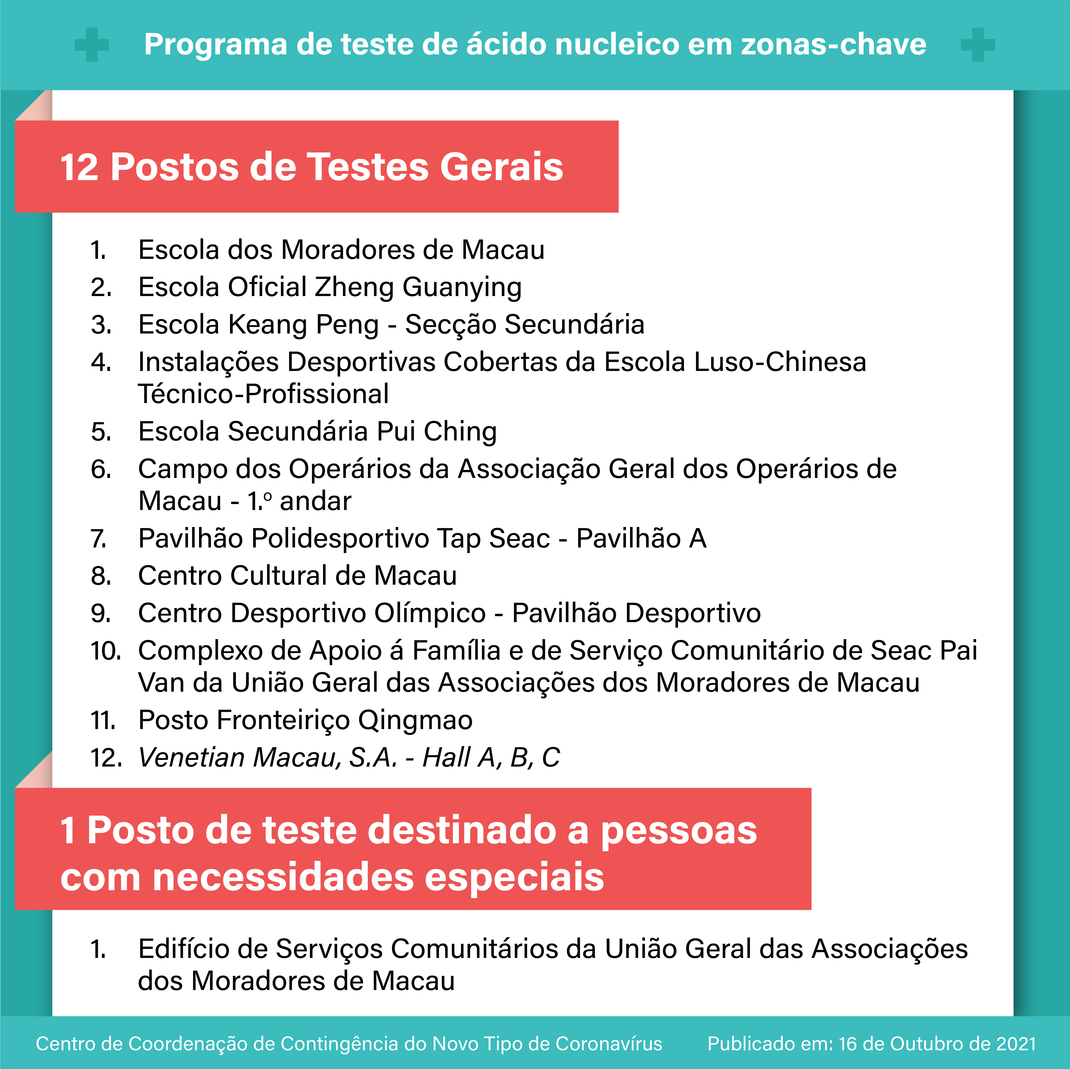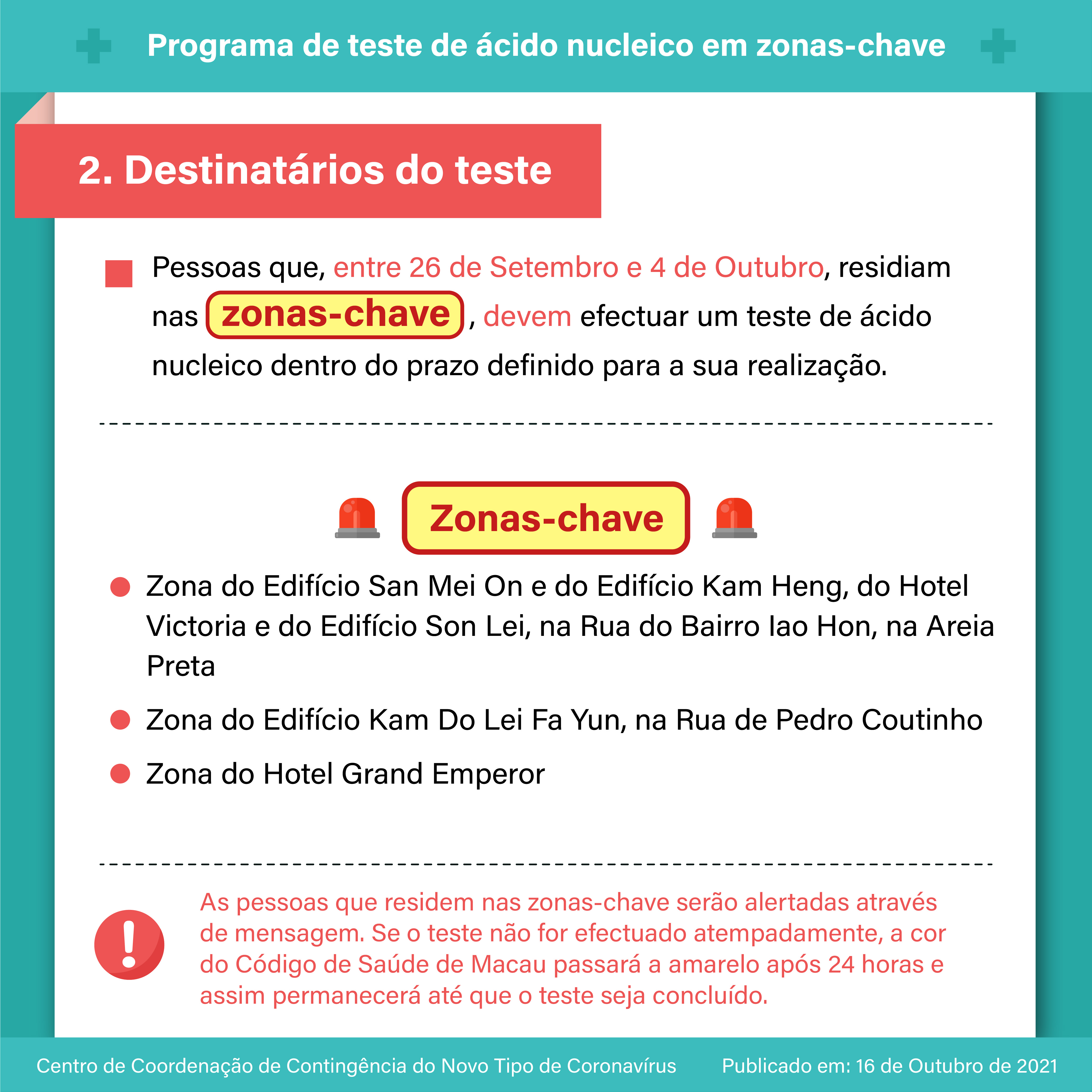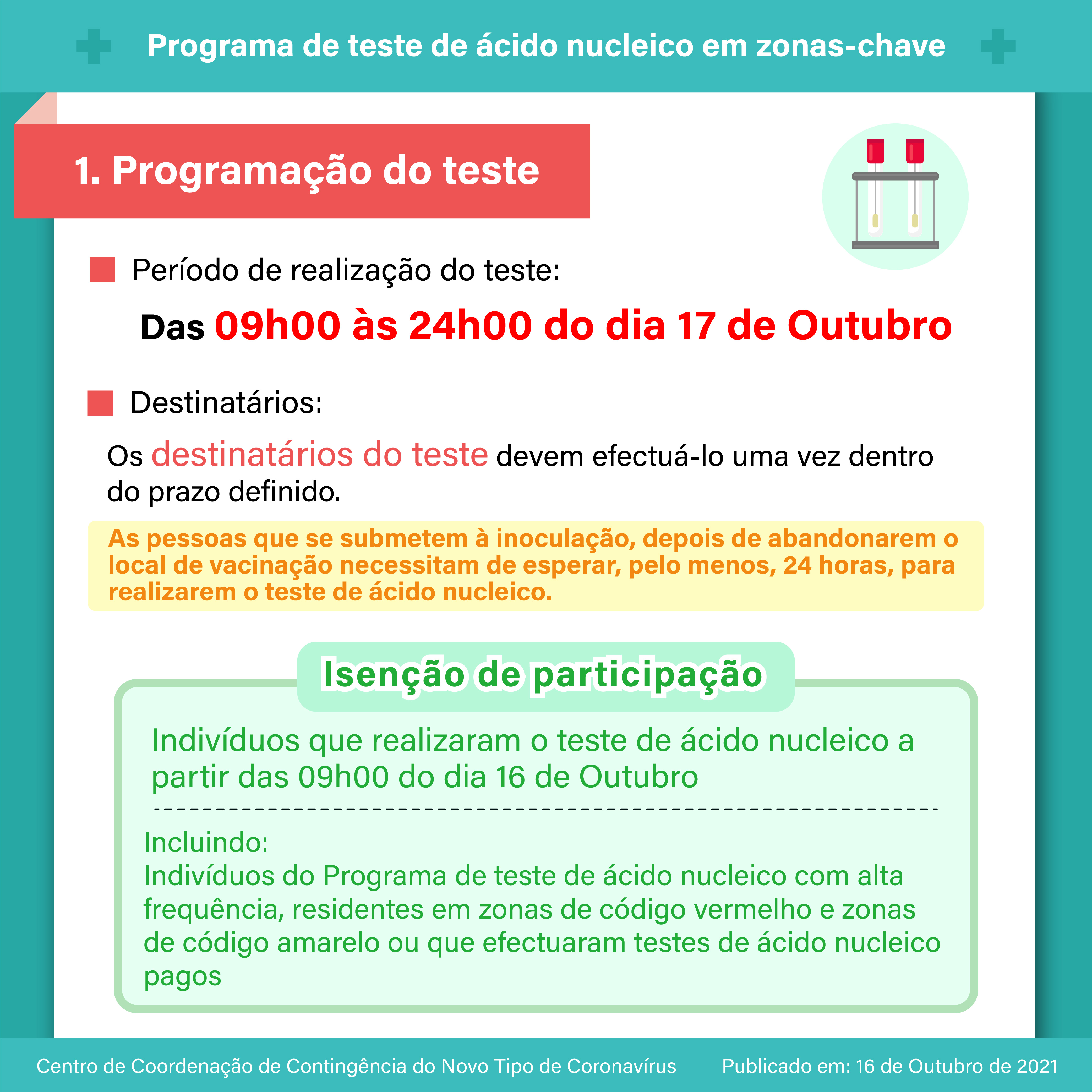 【Infografia】: O programa de teste de ácido nucleico em zonas-chave terá início no dia 17 de Outubro