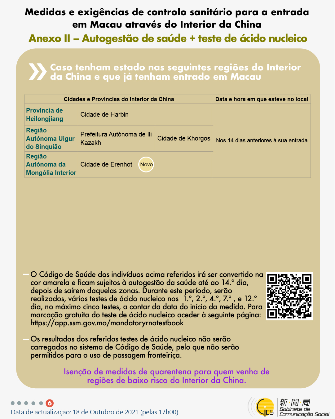 (Infografia)Medidas e exigências de controlo sanitário para a entrada em Macau de indivíduos de diferentes identidades, actualizadas no dia 18 de Outubro de 2021