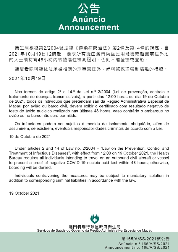 Face à epidemia do novo tipo de coronavírus, de acordo com as estipulações relevantes da Lei n. º 2/2004 «Lei de Prevenção, Controlo e Tratamento de Doenças Transmissíveis», os Serviços de Saúde exigem que, a partir das 12h00 de 19 de Outubro de 2021, todos os indivíduos que pretendam sair da Região Administrativa Especial de Macau por avião ou barco civil, devem exibir o certificado com resultado negativo de teste de ácido nucleico realizado nas últimas 48 horas a partir do dia de amostragem.