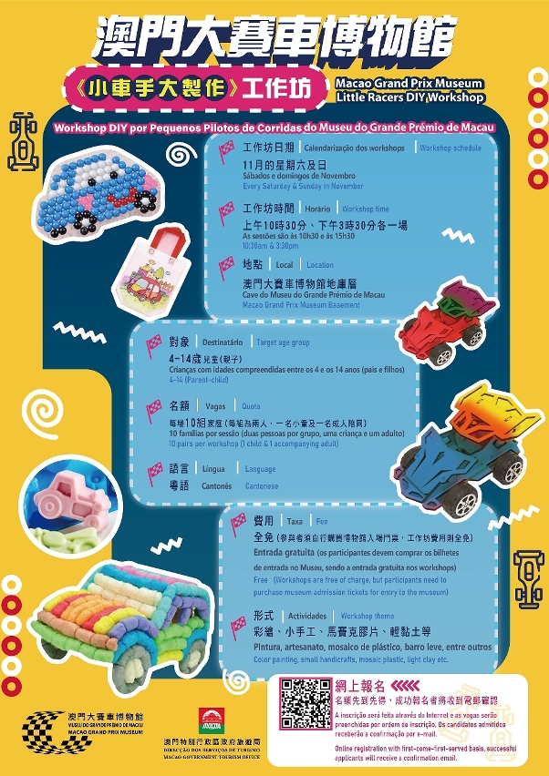 Todos os fins-de-semana de Novembro (nos dias 6, 7, 13, 14, 20, 21, 27 e 28) realizar-se-á um “Workshop DIY por Pequenos Pilotos de Corridas” na cave do Museu do Grande Prémio de Macau. Haverá duas sessões por dia (10h30 e 15h30). Cada workshop, conduzido em cantonense, pode acomodar dez famílias, com duas pessoas cada. Menores com idades compreendidas entre os 4 e os 14 anos e os seus pais são bem-vindos a participar. Os participantes têm de comprar os bilhetes de entrada para o Museu do Grande Prémio de Macau. Os workshops são gratuitos.