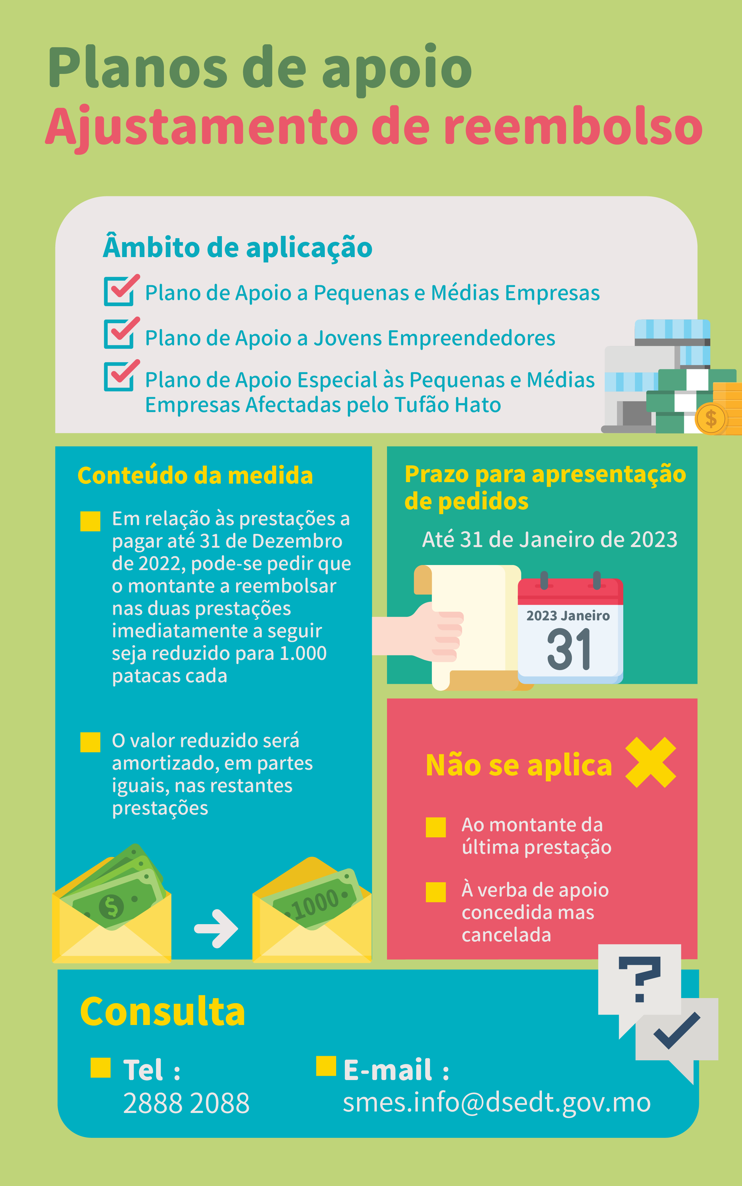 O prazo de candidatura à medida provisória Ajustamento de reembolso de diversos planos de apoio foi prorrogado mais uma vez e terminará até 31 de Janeiro de 2023. A referida medida é destinado ao ajustamento de reembolso efectuado antes de 31 de Dezembro de 2022, as empresas que tenham sido aprovadas para o ajustamento de reembolso no ano passado e neste ano podem apresentar, de novo, o pedido.