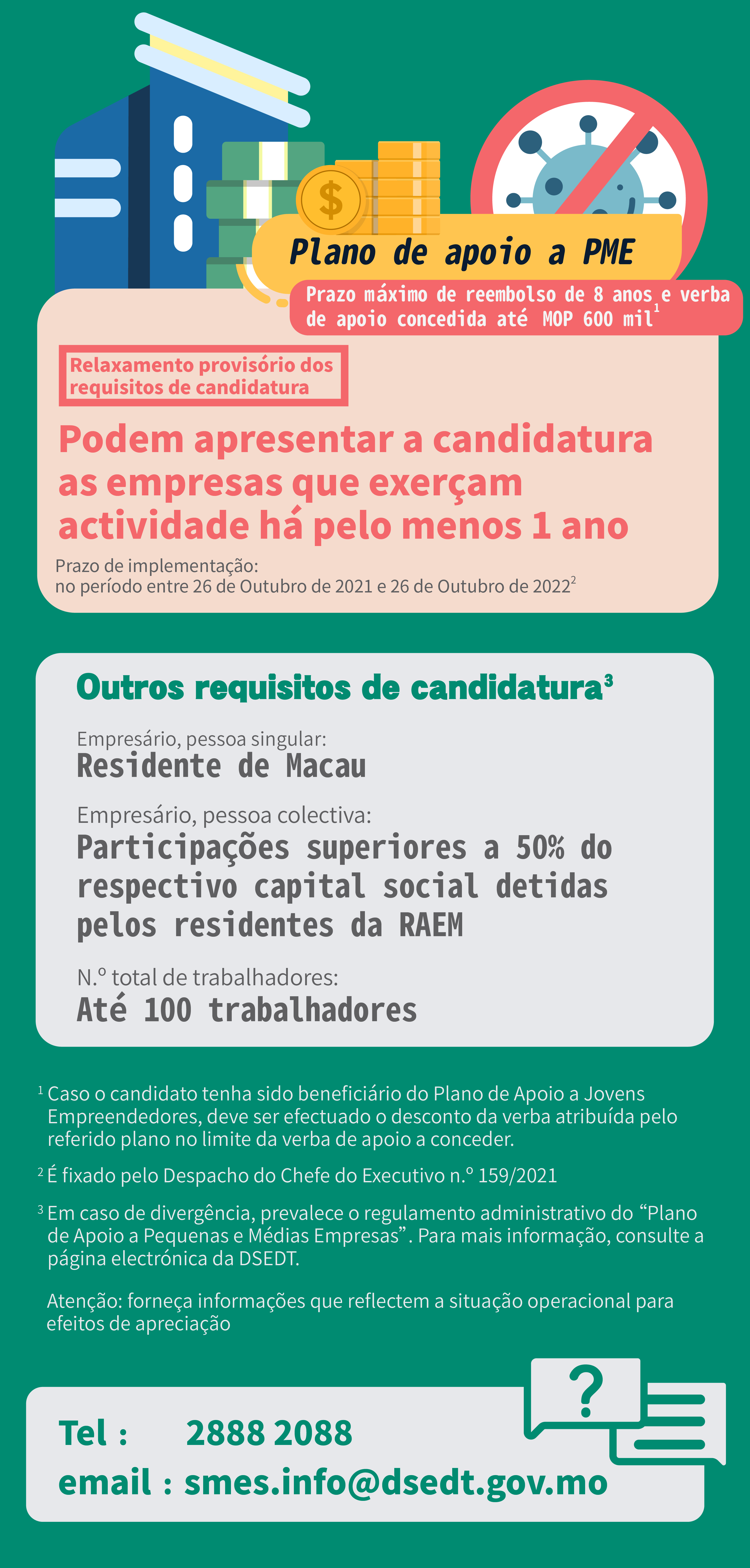 Já foram relaxados provisoriamente os requisitos de candidatura ao Plano de Apoio a Pequenas e Médias Empresas, pelo que, a partir de hoje (dia 26), as PME que exerçam actividade há pelo menos 1 anos e satisfaçam outros requisitos podem apresentar, junto da DSEDT, o pedido de concessão de empréstimo isento de juros até o valor de 600 mil patacas, com prazo de reembolso até 8 anos. O prazo de implementação desta medida de relaxamento provisório é de 12 meses e decorre até 26 de Outubro de 2022.