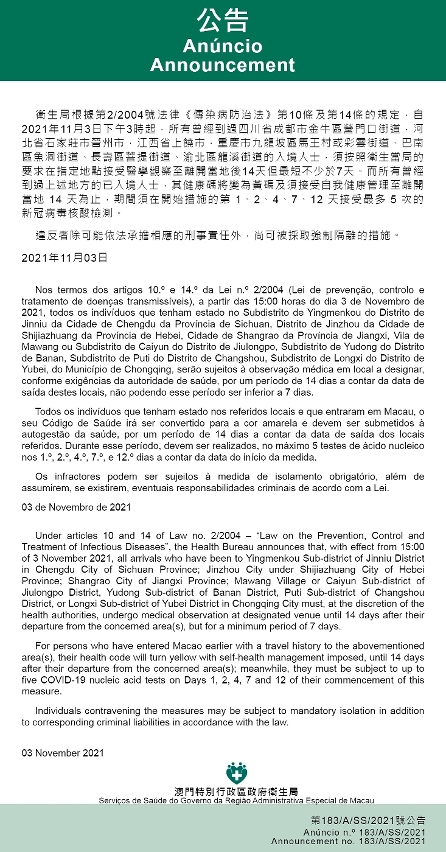 O Centro de Coordenação de Contingência do Novo Tipo de Coronavírus informa que tendo em consideração a evolução epidemiológica mais actualizada da Província de Sichuan, Província de Hebei, Província de Jiangxi e Cidade de Chongqing, os Serviços de Saúde, de acordo com os dispostos nos artigos 10.º e 14.º da Lei n.º 2/2004 (Lei de Prevenção, Controlo e Tratamento de Doenças Transmissíveis), determinam que a partir das 15:00 horas do dia 3 de Novembro de 2021, todos os indivíduos que tenham estado no Subdistrito de Yingmenkou do Distrito de Jinniu da Cidade de Chengdu da Província de Sichuan; Distrito de Jinzhou da Cidade de Shijiazhuang da Província de Hebei; Cidade de Shangrao da Província de Jiangxi; Vila de Mawang ou Subdistrito de Caiyun do Distrito de Jiulongpo, Subdistrito de Yudong do Distrito de Banan, Subdistrito de Puti do Distrito de Changshou, Subdistrito de Longxi do Distrito de Yubei, Município de Chongqing, serão sujeitos à observação médica em local a designar, conforme exigências da autoridade de saúde, por um período de 14 dias a contar da data de saída destes locais, não podendo esse período ser inferior a 7 dias.