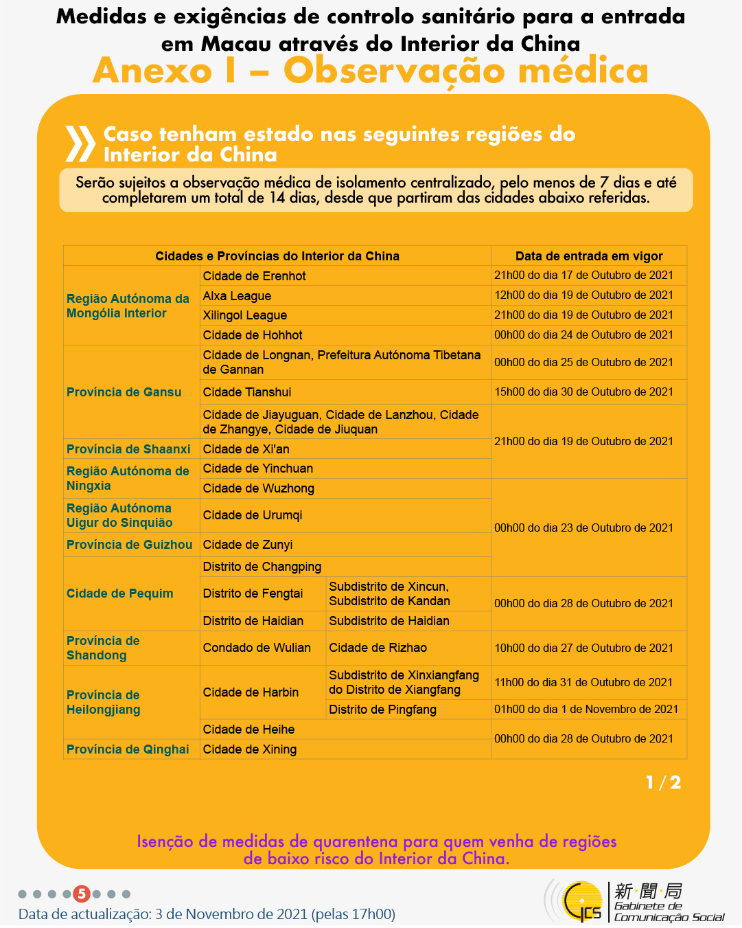 (Infografia)Medidas e exigências de controlo sanitário para a entrada em Macau de indivíduos de diferentes identidades, actualizadas no dia 5 de Novembro de 2021
