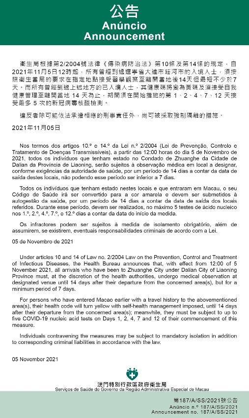 O Centro de Coordenação de Contingência do Novo Tipo de Coronavírus informa que tendo em consideração a evolução epidemiológica mais actualizada da Província de Sichuan e do Município de Chongqing, os Serviços de Saúde, de acordo com os dispostos nos artigos 10.º e 14.º da Lei n.º 2/2004 (Lei de Prevenção, Controlo e Tratamento de Doenças Transmissíveis), determinam que a partir das 12:00 horas do dia 5 de Novembro de 2021, todos os indivíduos que tenham estado no Condado de Zhuanghe da Cidade de Dalian da Província de Liaoning, serão sujeitos à observação médica em local a designar, conforme exigências da autoridade de saúde, por um período de 14 dias a contar da data de saída destes locais, não podendo esse período ser inferior a 7 dias.