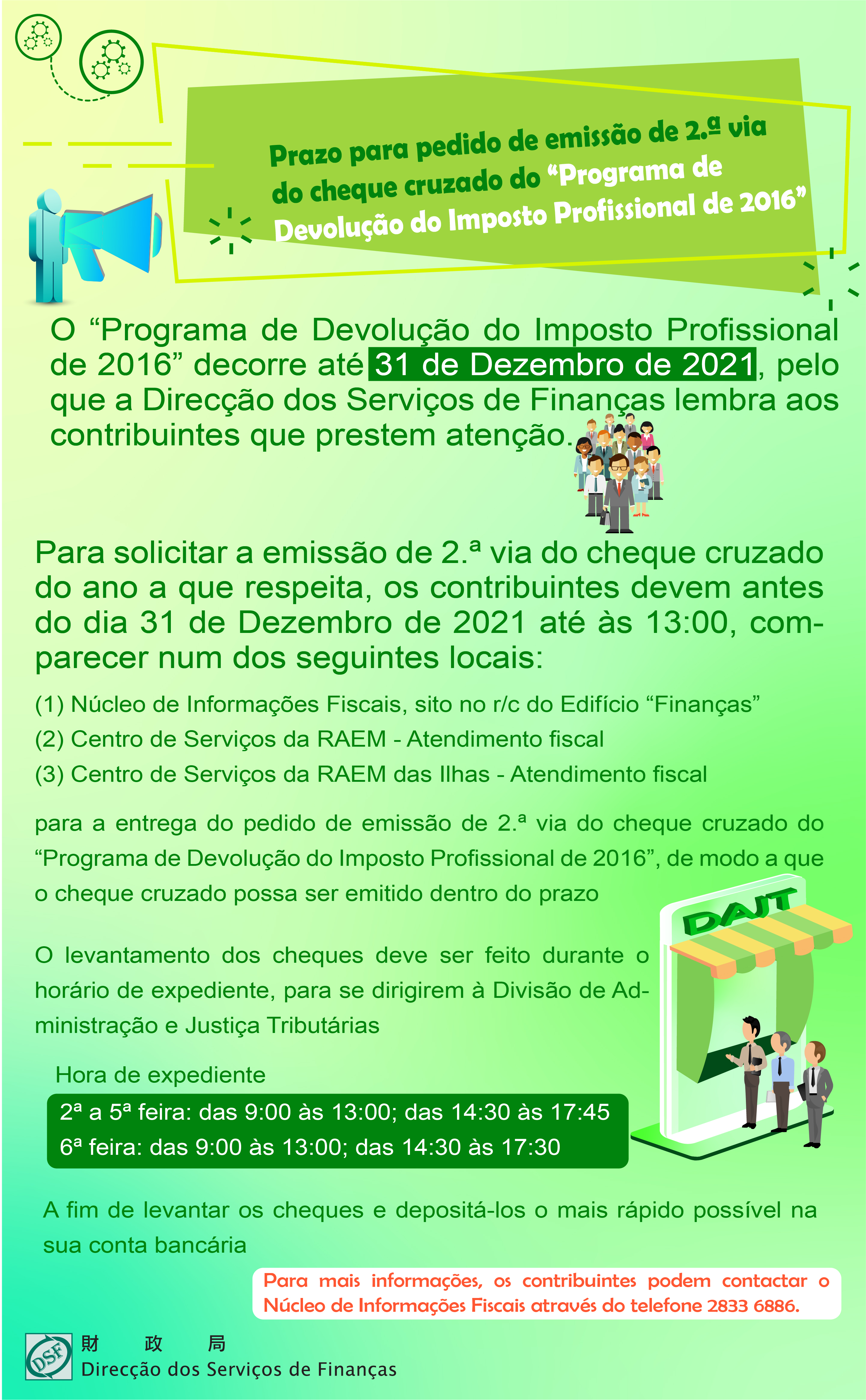 Ao abrigo do disposto da Lei do Orçamento de 2018, o prazo para pedido de emissão de 2.ª via do cheque cruzado relativo ao “Programa de Devolução do Imposto Profissional de 2016” decorre até 31 de Dezembro de 2021, pelo que a Direcção dos Serviços de Finanças lembra aos contribuintes que prestem atenção.