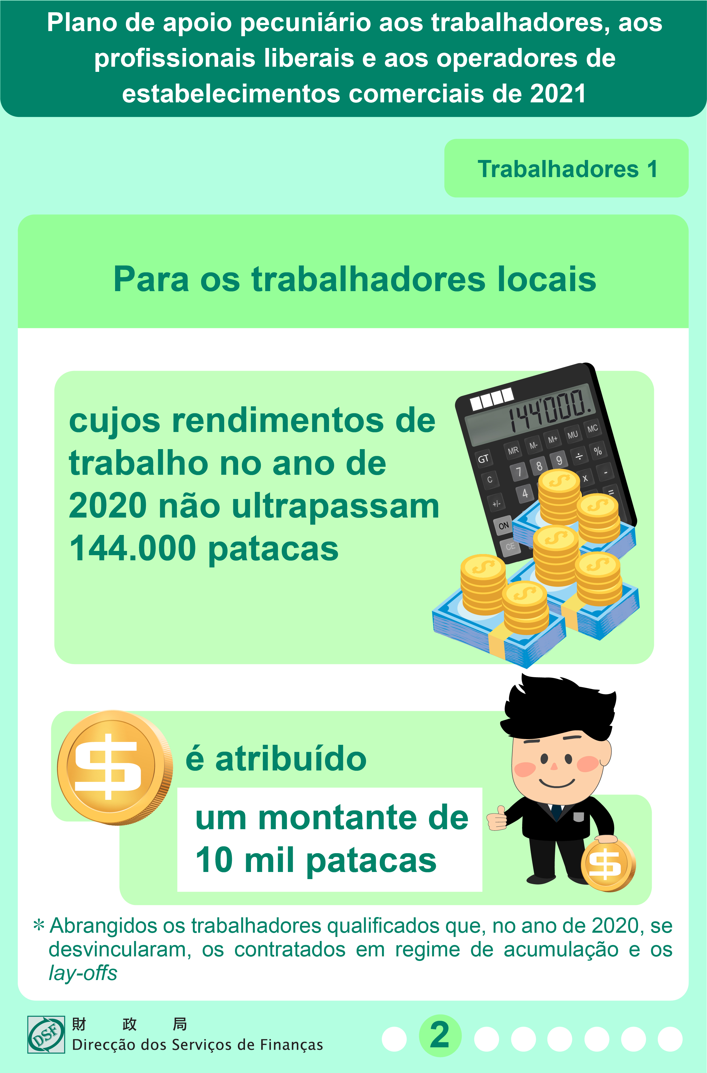 De acordo com o “plano de apoio”, aos trabalhadores locais, cuja receita laboral do exercício de 2020 não tenha superado 144.000 patacas, é atribuído 10.000 patacas por cada um deles, beneficiários estes que abrangem, ainda, os trabalhadores locais qualificados que no ano de 2020 se desvincularam, bem como os contratados em regime de acumulação e os lay-offs.