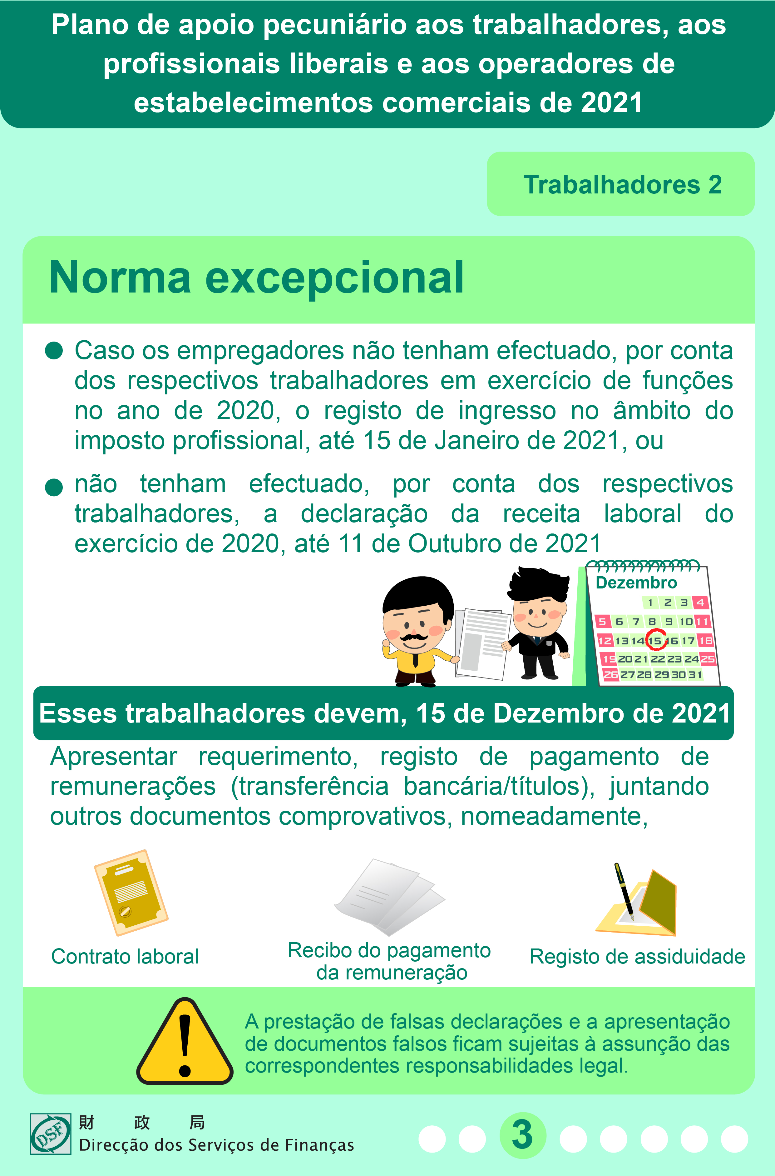 O requerimento acima mencionado deve ser entregue à DSF até de 15 de Dezembro de 2021, juntando os registos de transferência bancária aquando dos pagamentos de remunerações ou recibos e outras provas, nomeadamente, o contrato laboral, os recibos de pagamento de remunerações ou as informações de registo de assiduidade.