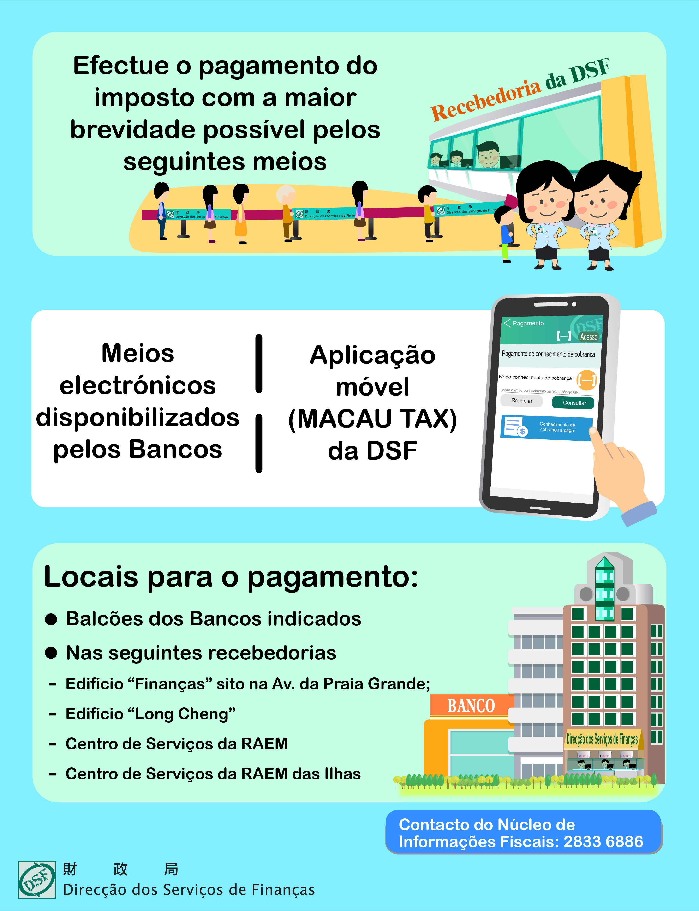 A Direcção dos Serviços de Finanças vem lembrar os contribuintes que o prazo de pagamento da 2.ª prestação do Imposto Complementar de Rendimentos termina no próximo dia 30 de Novembro. o não pagamento da mesma dentro do mês de vencimento que consta do conhecimento da cobrança (Novembro) implica a cobrança de juros de mora e 3% de dívidas. Para evitar perdas de tempo de espera ou o pagamento adicional de juros de mora e multa devido ao pagamento fora do prazo, esta Direcção de Serviços apela aos contribuintes que ainda não o fizeram para efectuarem o respectivo pagamento com a maior brevidade possível, por meio das formas de pagamento disponibilizadas pelos Serviços de Finanças, podendo ainda fazê-lo dentro das horas de expediente, nos balcões dos Bancos indicados ou por sua transacção electrónica, além disso, utilize a aplicação móvel (MACAU TAX) da DSF para digitalizar o QRcode do conhecimento de cobrança, para ligar-se à plataforma de pagamento móvel, e efectuar o pagamento do imposto ou nas Recebedorias instaladas, respectivamente, no Edifício “Finanças”, no Edifício “Long Cheng”, no Centro de Serviços da RAEM e no Centro de Serviços da RAEM das Ilhas.
