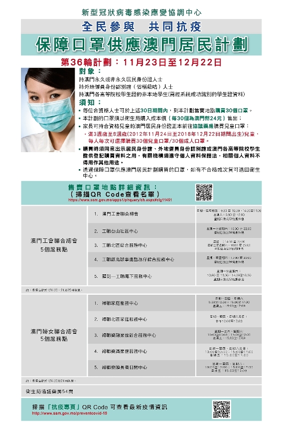 O Centro de Coordenação de Coordenação de Contingência do Novo Tipo de Coronavírus informa que no próximo dia 23 de Novembro, Terça-feira, terá inicio o 36.º Plano de fornecimento de máscaras destinado aos residentes de Macau. O período de venda irá decorrer durante 30 dias, entre 23 de Novembro e 22 de Dezembro de 2021.
