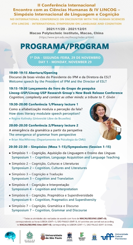 Para promover a interdisciplinaridade na área de investigação sobre “Cognição e Linguagem”, bem como outros estudos afins, considerando a construção da plataforma de intercâmbio e cooperação no que diz respeito às ciências humanas na Área da Grande Baía Guangdong-Hong Kong-Macau e no contexto das interações entre a China e os países de Língua Portuguesa, bem como entre a China e o mundo, através da Região Administrativa Especial de Macau (RAEM), a Escola Superior de Línguas e Tradução (ESLT) do Instituto Politécnico de Macau (IPM) e a Universidade de São Paulo (USP), em parceria com as instituições: Universidade Federal Fluminense (UFF), Universidade Federal Rural de Pernambuco (UFRPE) e Instituto Federal de São Paulo (IFSP) organizam em conjunto um evento académico on-line II Conferência Internacional Encontro com as Ciências Humanas & IV LinCog - Simpósio Internacional de Linguagem e Cognição que ocorrerá do dia 29 de novembro ao dia 1 de dezembro de 2021. O tema geral é “Cognição, língua, cultura e tradução: um diálogo sem fronteiras e interdisciplinar”. Os idiomas da conferência são: Português e Inglês.