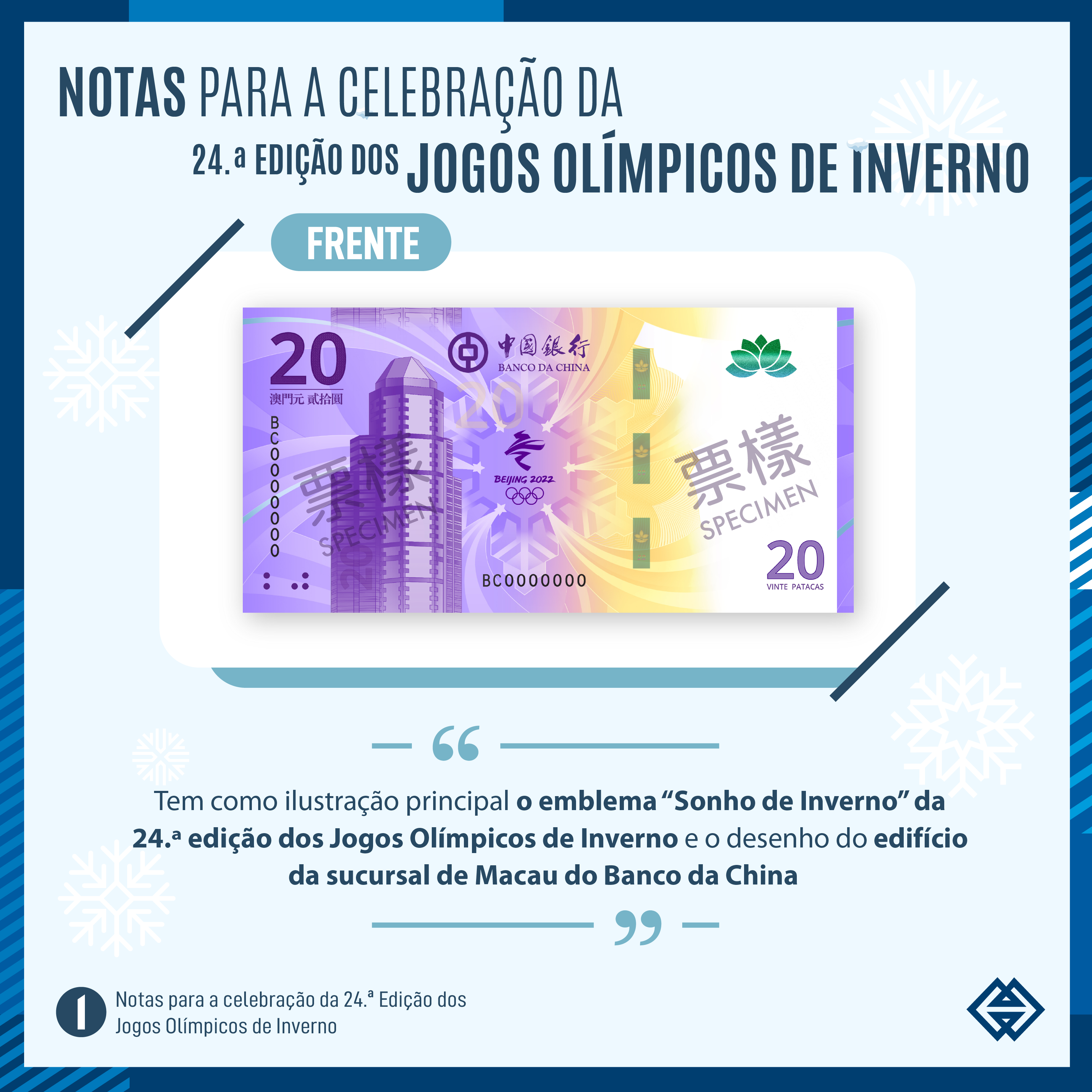 Com vista a celebrar a 24ª Edição dos Jogos Olímpicos, o Banco da China foi autorizado a emitir notas de vinte patacas para a celebração da 24ª Edição dos Jogos Olímpicos de Inverno, as quais serão colocadas à subscrição dos residentes de Macau, a partir da próxima Quarta-feira (dia 1 de Dezembro).