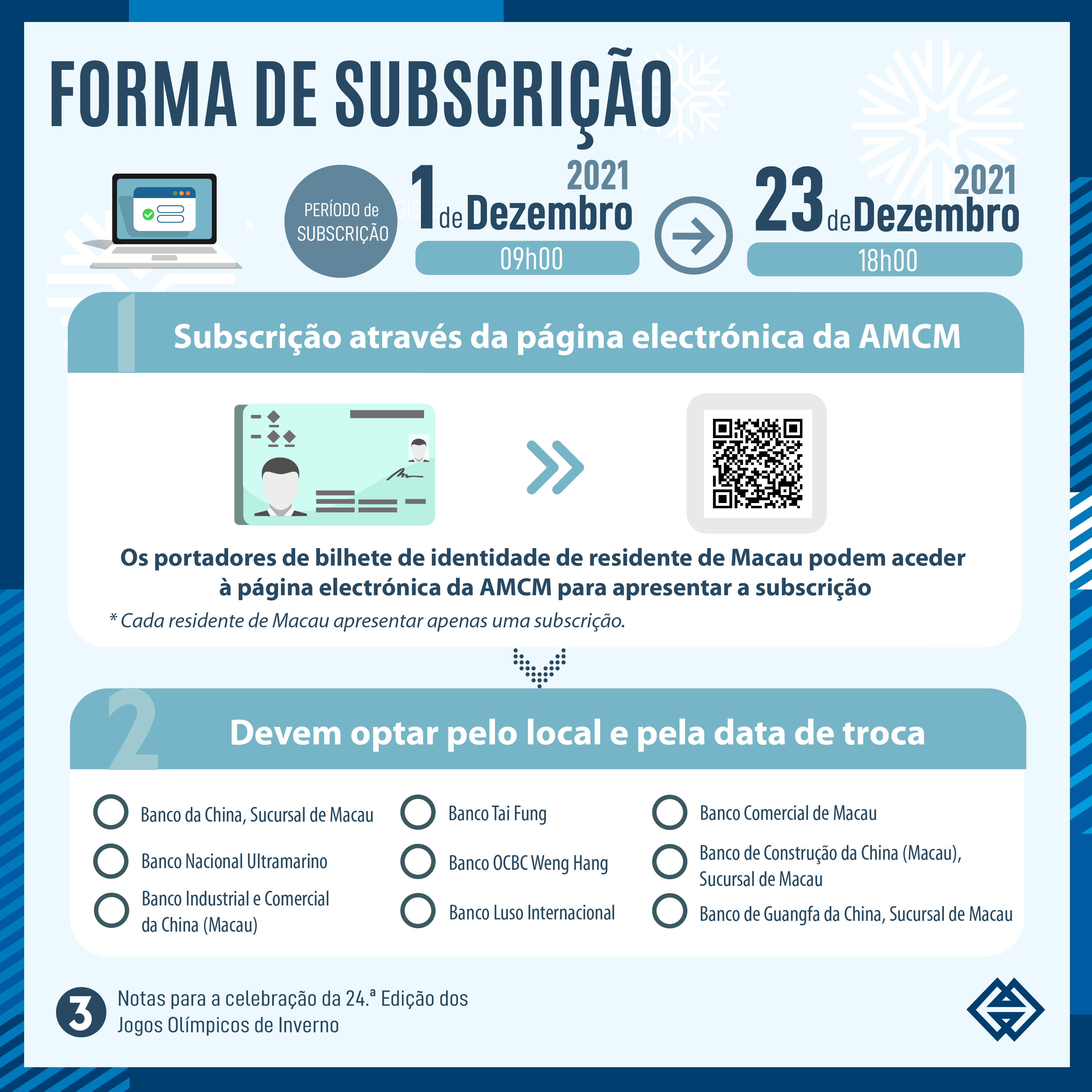 O período de subscrição é de 1 de Dezembro de 2021 (desde as 9 horas) a 23 de Dezembro de 2021 (até às 18 horas), podendo os portadores de bilhete de identidade de residente de Macau aceder à página electrónica da AMCM para proceder à respectiva subscrição, podendo cada residente de Macau apresentar apenas uma subscrição.