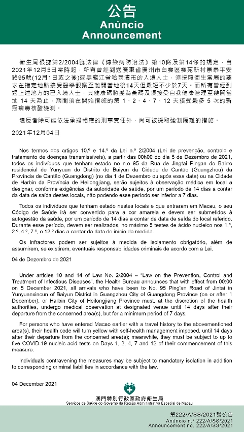 O Centro de Coordenação de Contingência do Novo Tipo de Coronavírus informa que tendo em consideração a evolução epidemiológica mais actualizada da Província de Cantão (Guangdong) e da Província de Heilongjiang, nos termos dos artigos 10.º e 14.º da Lei n.º 2/2004 (Lei de Prevenção, Controlo e Tratamento de Doenças Transmissíveis), a partir das 00h00 do dia 5 de Dezembro de 2021, todos os indivíduos que tenham estado no n.o 95 da Rua de Jingtai Pingan do Bairro residencial de Yunyuan do Distrito de Baiyun da Cidade de Cantão (Guangzhou) da Província de Cantão (Guangdong) (no dia 1 de Dezembro ou após essa data), ou na Cidade de Harbin da Província de Heilongjian, serão sujeitos à observação médica em local a designar, conforme exigências da autoridade de saúde, por um período de 14 dias a contar da data de saída deste local, não podendo esse período ser inferior a 7 dias.