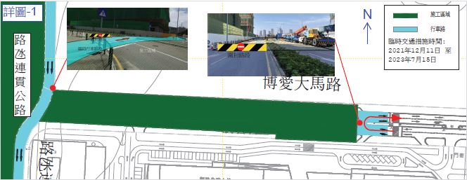 - Durante o período entre os dias 11 de Dezembro de 2021 e 15 de Julho de 2023, será encerrado temporariamente o troço oeste da Avenida da Fraternidade (perto da Estrada do Istmo) e criado um espaço para os condutores se virarem, em virtude de deslocação das tubagens de abastecimento de água e de gás natural, de pré-perfuração das fundações por estacas, de construção da fundação e superestrutura da passagem superior para peões (vide desenho 1).
