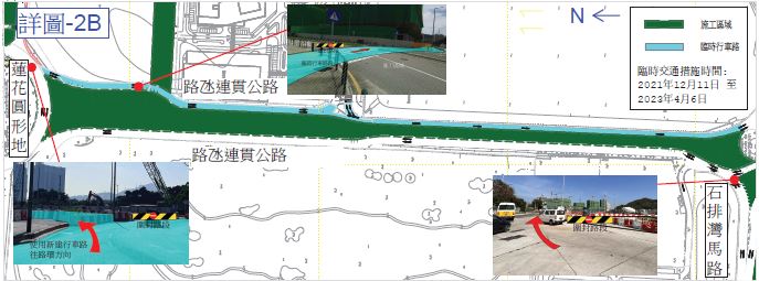 - Durante o período entre os dias 11 de Dezembro de 2021 e 6 de Abril de 2023, da Rotunda Flor de Lótus para Coloane/Seac Pai Van no sentido sul, os condutores devem utilizar a nova faixa de rodagem temporária. No entanto, serão implementadas as medidas de condicionamento de trânsito na estrada em direcção ao Reservatório Seac Pai Van (vide desenho 2B).