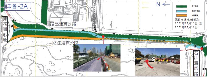 - Durante o período entre os dias 11 de Dezembro de 2021 e 13 de Dezembro de 2021, na Estrada do Istmo, da Rotunda de Seac Pai Van para a Rotunda Flor de Lótus, os condutores devem utilizar a faixa de rodagem temporária, por causa da obra de reparação das tampas no pavimento (vide desenho 2A).