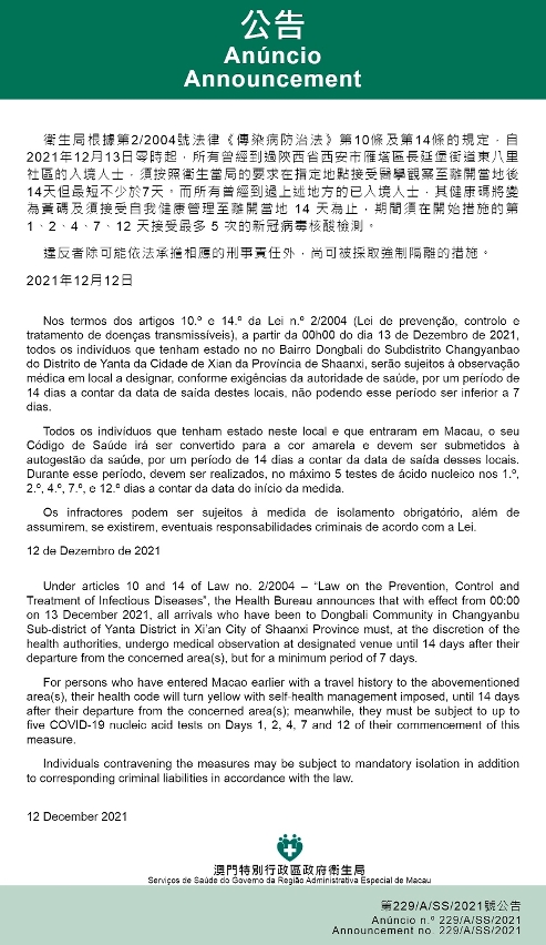 O Centro de Coordenação de Contingência do Novo Tipo de Coronavírus informa que tendo em consideração a evolução epidemiológica mais actualizada na Província de Zhejiang, nos termos dos artigos 10.º e 14.º da Lei n.º 2/2004 (Lei de prevenção, controlo e tratamento de doenças transmissíveis), a partir da 00h00 do dia 13 de Dezembro de 2021, todos os indivíduos que tenham estado no Bairro Dongbali do Subdistrito Changyanbao do Distrito de Yanta da Cidade de Xian da Província de Shaanxi, serão sujeitos à observação médica em local a designar, conforme exigências da autoridade de saúde, por um período de 14 dias a contar da data de saída deste local, não podendo esse período ser inferior a 7 dias.