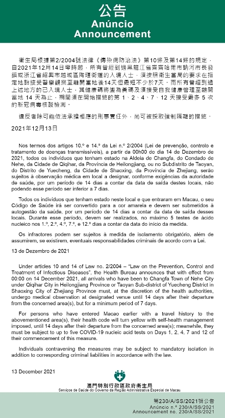 O Centro de Coordenação de Contingência do Novo Tipo de Coronavírus informa que tendo em consideração a evolução epidemiológica mais actualizada nas Províncias de Heilongjiang e de Zhejiang, a partir da 00h00 do dia 14 de Dezembro de 2021, todos os indivíduos que tenham estado naAldeia de Changfa, do Condado de Nehe, da Cidade de Qiqihar, da Província de Heilongjiang, ou no Subdistrito de Taoyan, do Distrito de Yuecheng, da Cidade de Shaoxing, da Província de Zhejiang, serão sujeitos à observação médica em local a designar, conforme exigências da autoridade de saúde, por um período de 14 dias a contar da data de saída deste local, não podendo esse período ser inferior a 7 dias.