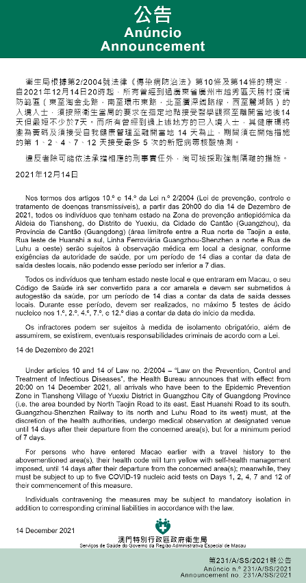 O Centro de Coordenação de Contingência do Novo Tipo de Coronavírus informa que tendo em consideração a evolução epidemiológica mais actualizada na Província de Cantão (Guangdong), a partir da 20h00 do dia 14 de Dezembro de 2021,todos os indivíduos que tenham estado na Zona de prevenção antiepidémica da Aldeia de Tiansheng, do Distrito de Yuexiu, da Cidade de Cantão (Guangzhou), da Província de Cantão (Guangdong) (área limítrofe entre a Rua norte de Taojin a este, Rua leste de Huanshi a sul, Linha Ferroviária Guangzhou-Shenzhen a norte e Rua de Luhu a oeste), serão sujeitos à observação médica em local a designar, conforme exigências da autoridade de saúde, por um período de 14 dias a contar da data de saída deste local, não podendo esse período ser inferior a 7 dias.
