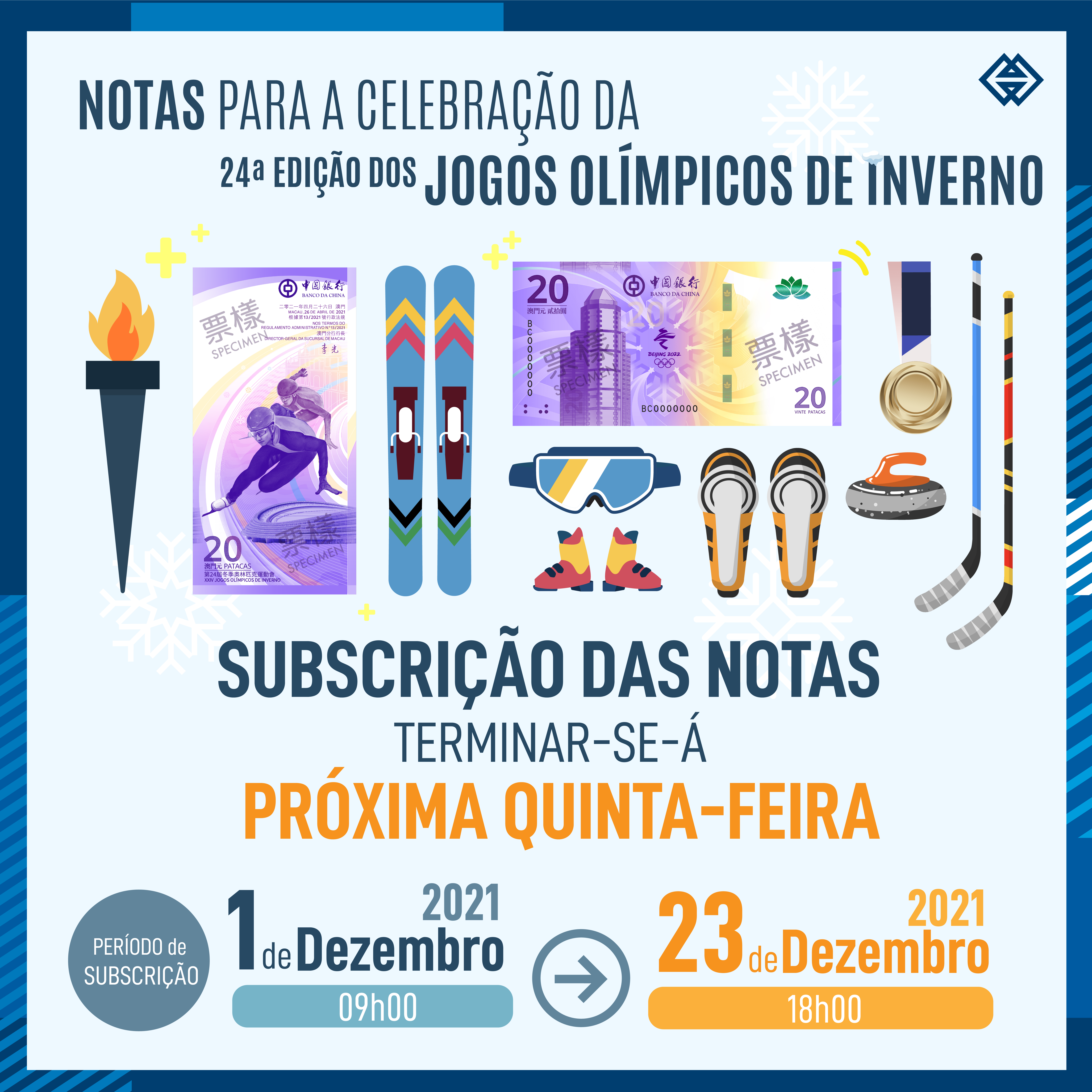 O prazo para a subscrição das notas para a celebração da 24ª Edição dos Jogos Olímpicos de Inverno terminará às 18 horas de 23 de Dezembro de 2021 (quinta-feira). Assim sendo, a AMCM alerta os residentes de Macau interessados na troca das referidas notas para o facto de estes deverem proceder, à referida subscrição “on-line”, o mais rápido possível.