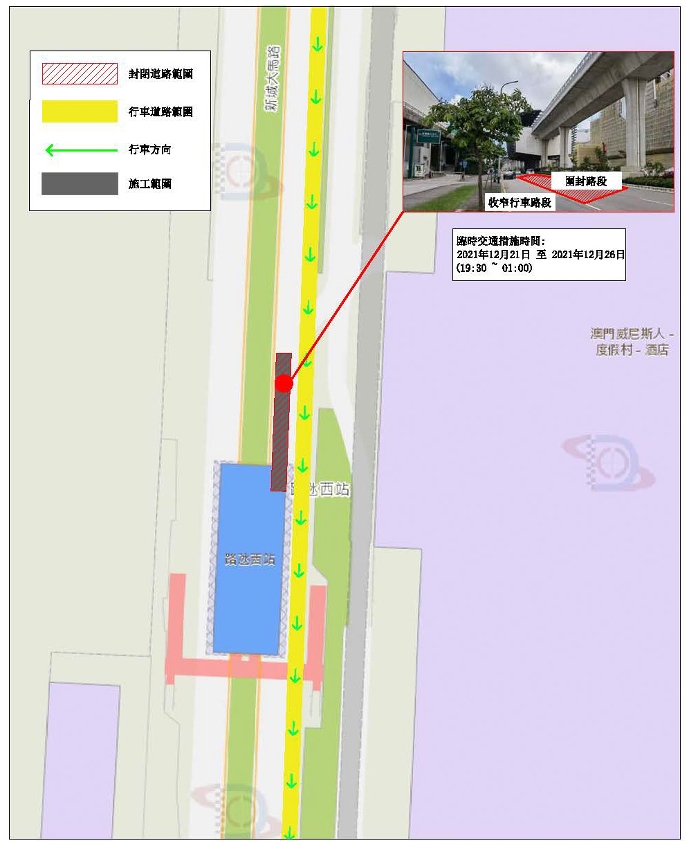 - No período entre 21 e 26 de Dezembro de 2021, das 21H00 à 01H00 do dia seguinte, será vedada a via do meio da faixa de rodagem da Rotunda da Piscina Olímpica em direcção à Estação do Estádio, pelo que o trânsito nas vias em direcção ao Centro de Taipa ficará condicionado. (vide planta 1)